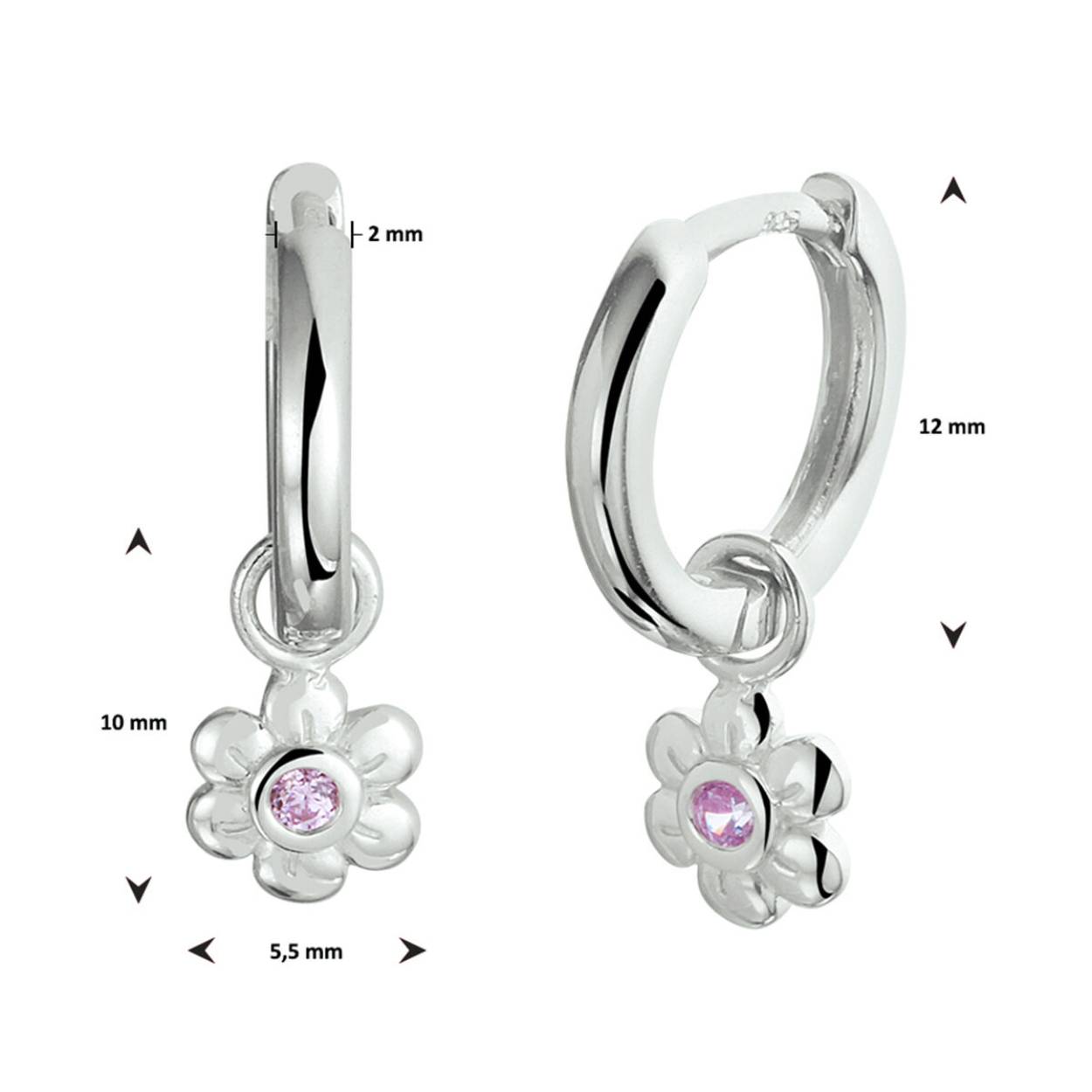 Gerhodineerd 925 zilveren oorringen uitgevoerd met een bloem en een schitterende roze zirkonia. De totale afmeting van de oorringen is 12x2mm. De afmeting van de hanger is 10x5.5mm.