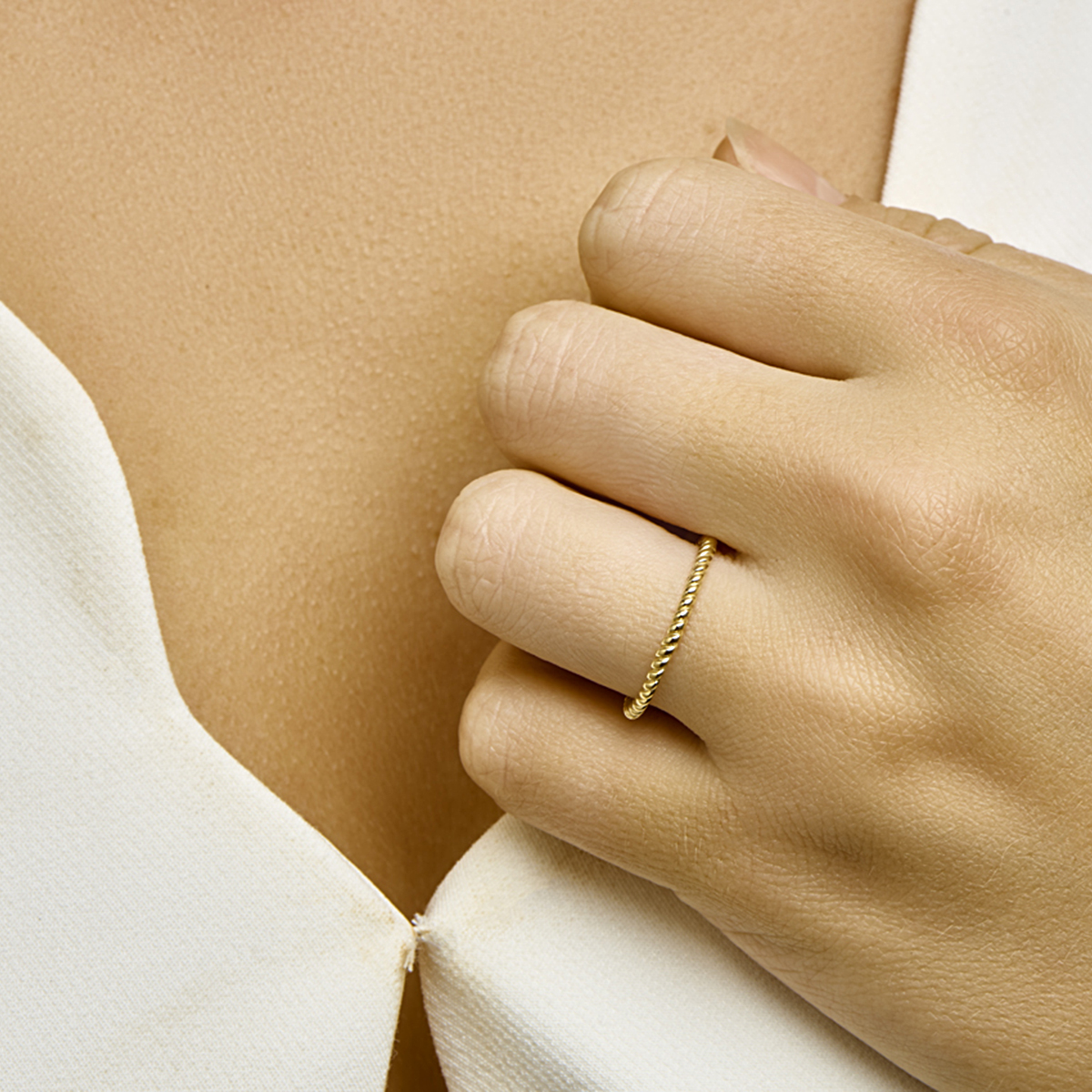 Geelgouden aanschuifring waarbij de scheen verdraaid lijkt en geeft de ring een een elegante uitstraling. De ring heeft een breedte van 1.5mm en heeft een poli afwerking. Tip: Door het simplistische model is deze ring goed te combineren met andere sieraden uit onze collectie of uit je eigen sieraden stash!