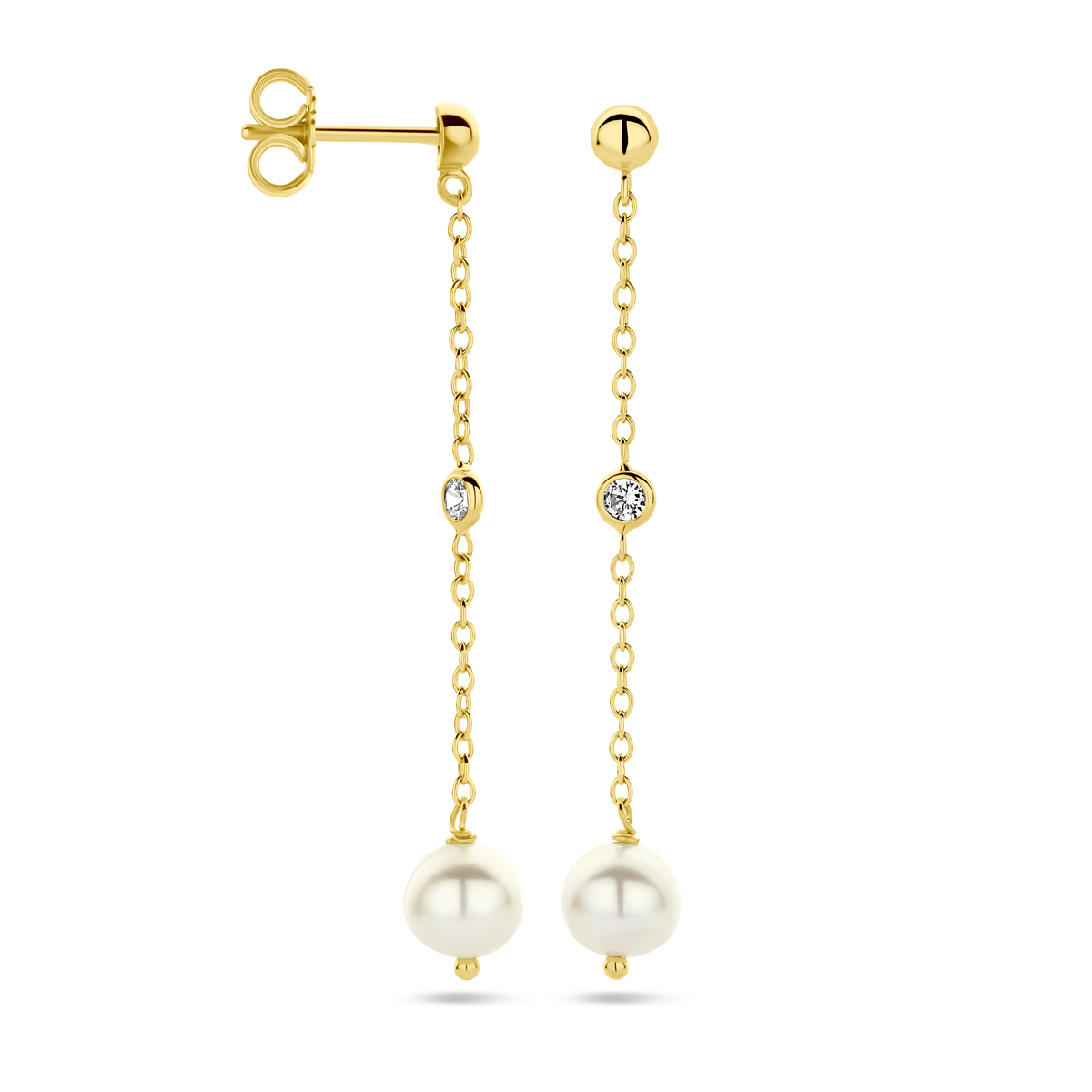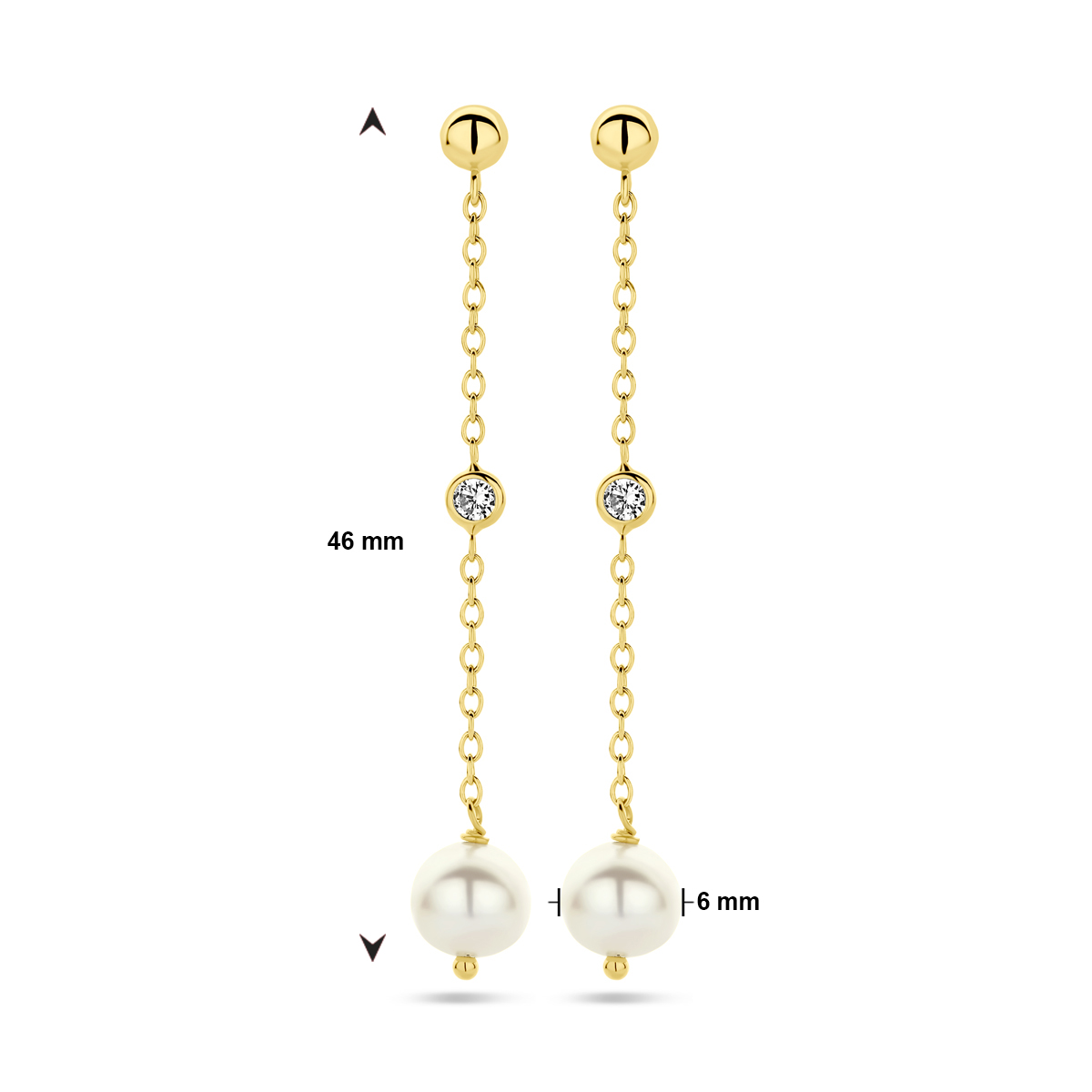 14k Geelgouden oorhangers uitgevoerd met zoetwaterparel en zirkonia. De oorhangers hebben een totale hoogte van 46mm.