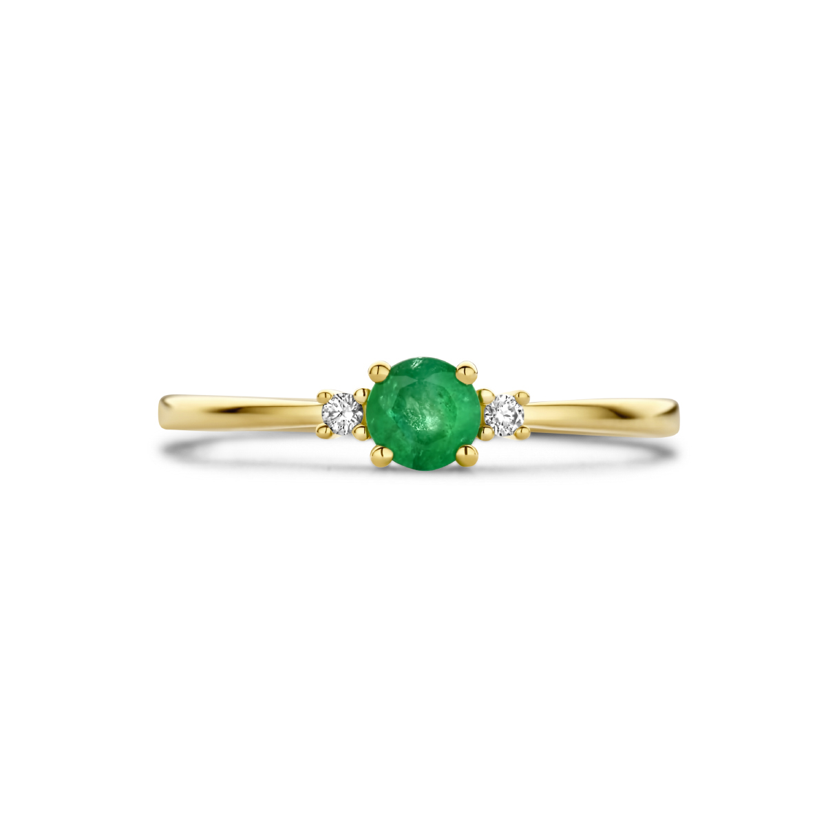 14k Geelgouden ring uitgevoerd met schitterende smaragd en natuurlijke diamant. De ring heeft een breedte van 4mm. Het diamantgewicht is 0.03ct (2x 0.015ct).