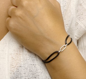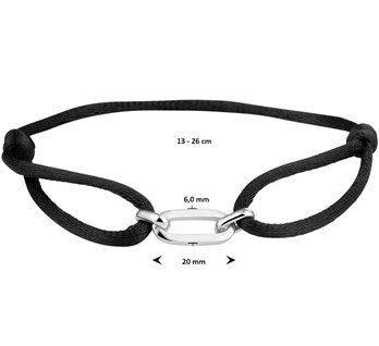 Zwart gevlochten armband uitgevoerd met een 925 zilveren element. De armband heeft draaglengtes van 13 tot 26cm. Het element heeft een afmeting van 20x6mm.