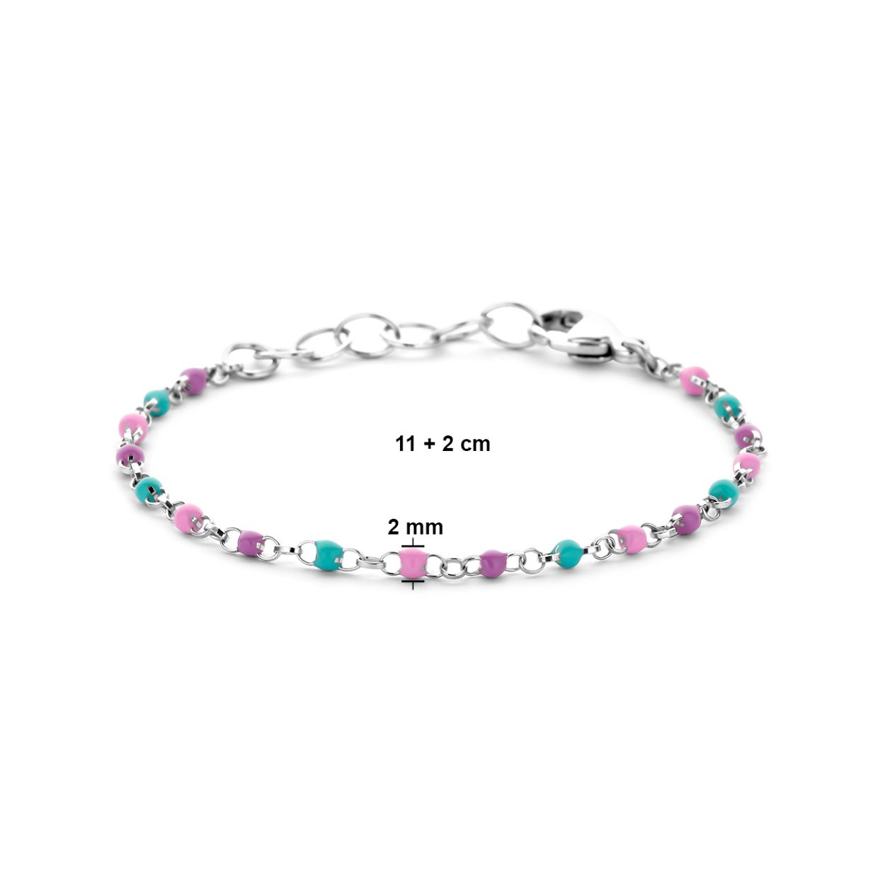 Gerhodineerd 925 zilveren armband uitgevoerd met emaille bolletjes. De armband heeft een draaglengte van 11cm en een extensie van 2cm. Uitgevoerd met karabijnsluiting. De schakelbreedte is 1.7mm.