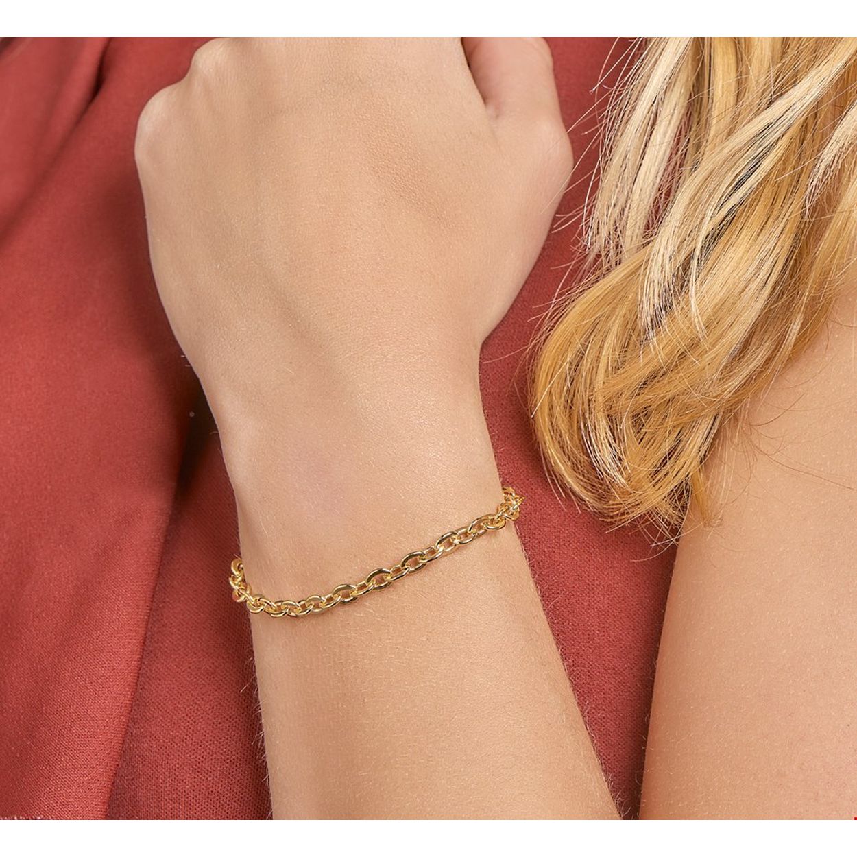 Beschrijving: Sieraden van 14 karaat goud met daarin een kern van 925 zilver. Geelgouden armband met een draaglengte van 19cm en een schakelbreedte van 5mm. Uitgevoerd met een karabijn sluiting.