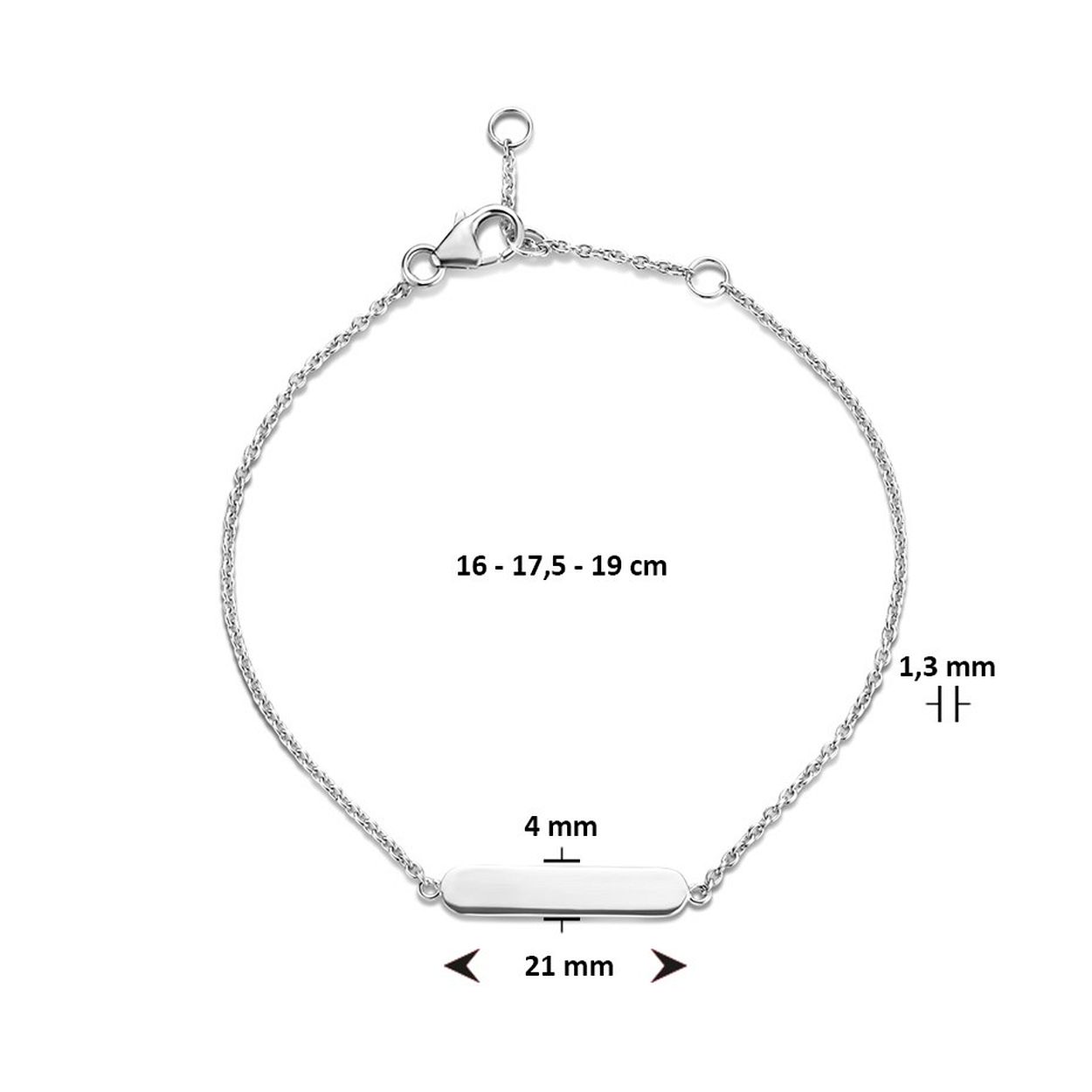 Gerhodineerd 925 zilveren armband uitgevoerd met een graveerplaatje met een afmeting van 4x21mm. De armband heeft draaglengtes van 16, 17.5 en 19cm en een stevige karabijn sluiting.