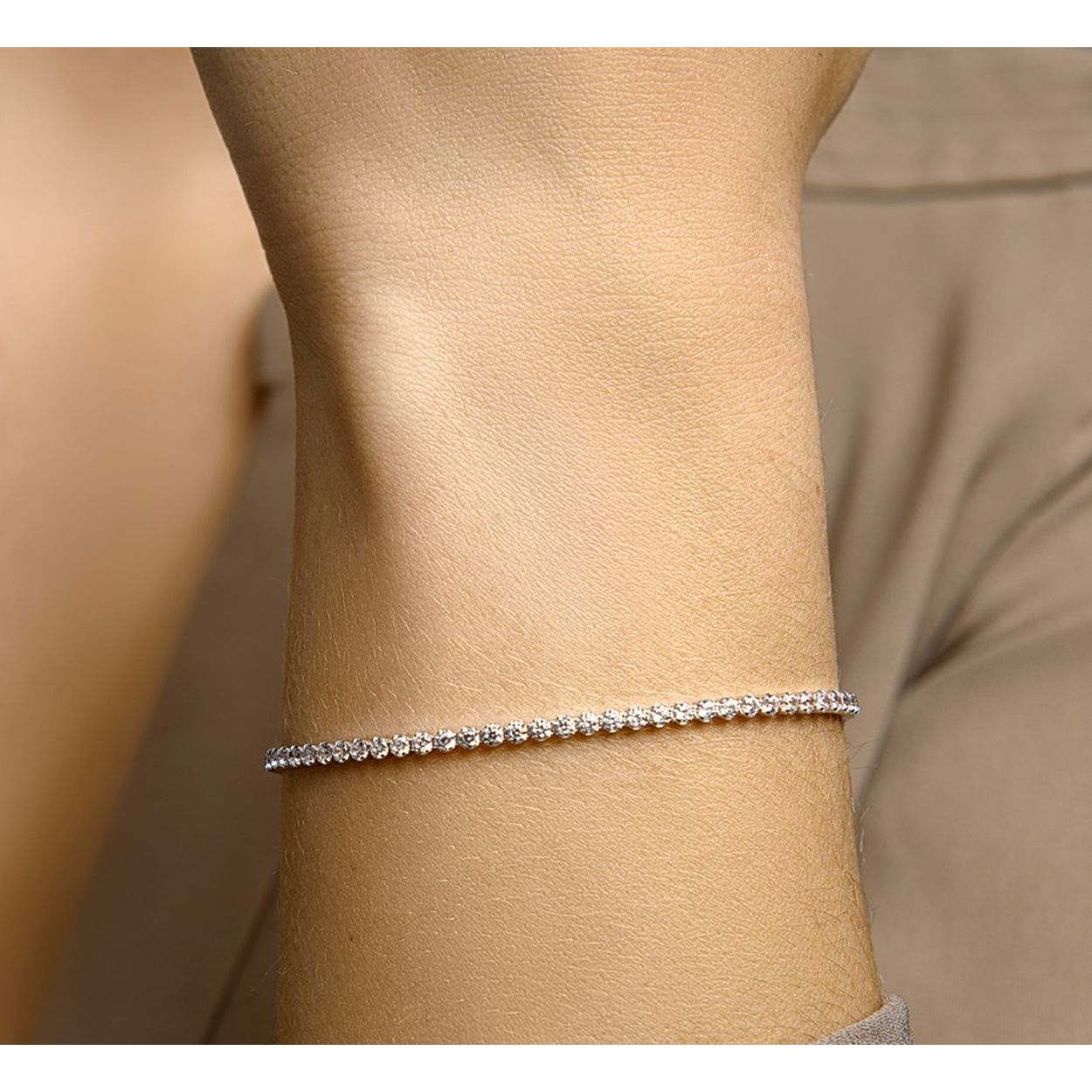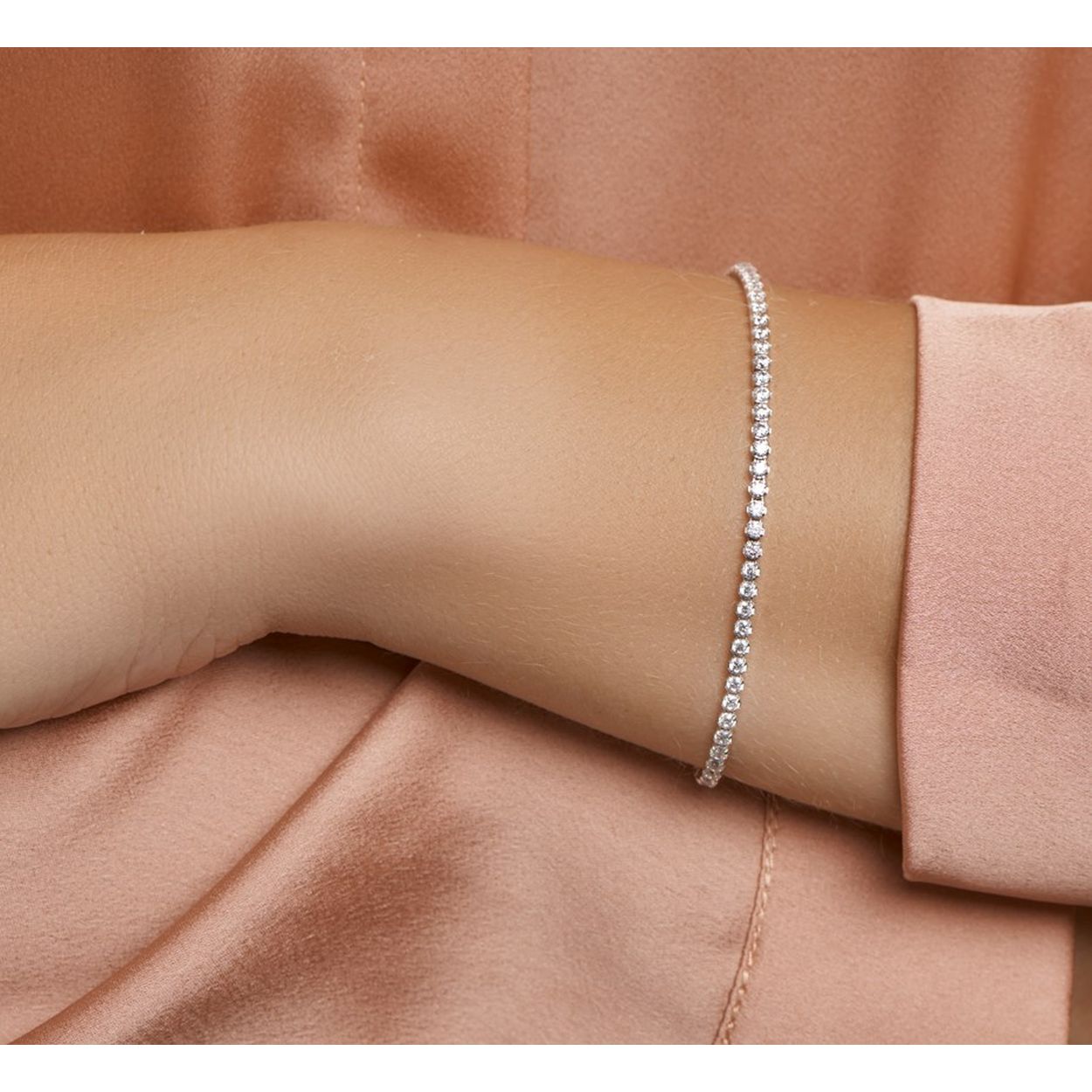 Gerhodineerd 925 zilveren tennisarmband uitgevoerd met een schitterende zirkonia rij en een stevige karabijn sluiting. De armband heeft een draaglengte van 17cm en een breedte van 2.5mm.