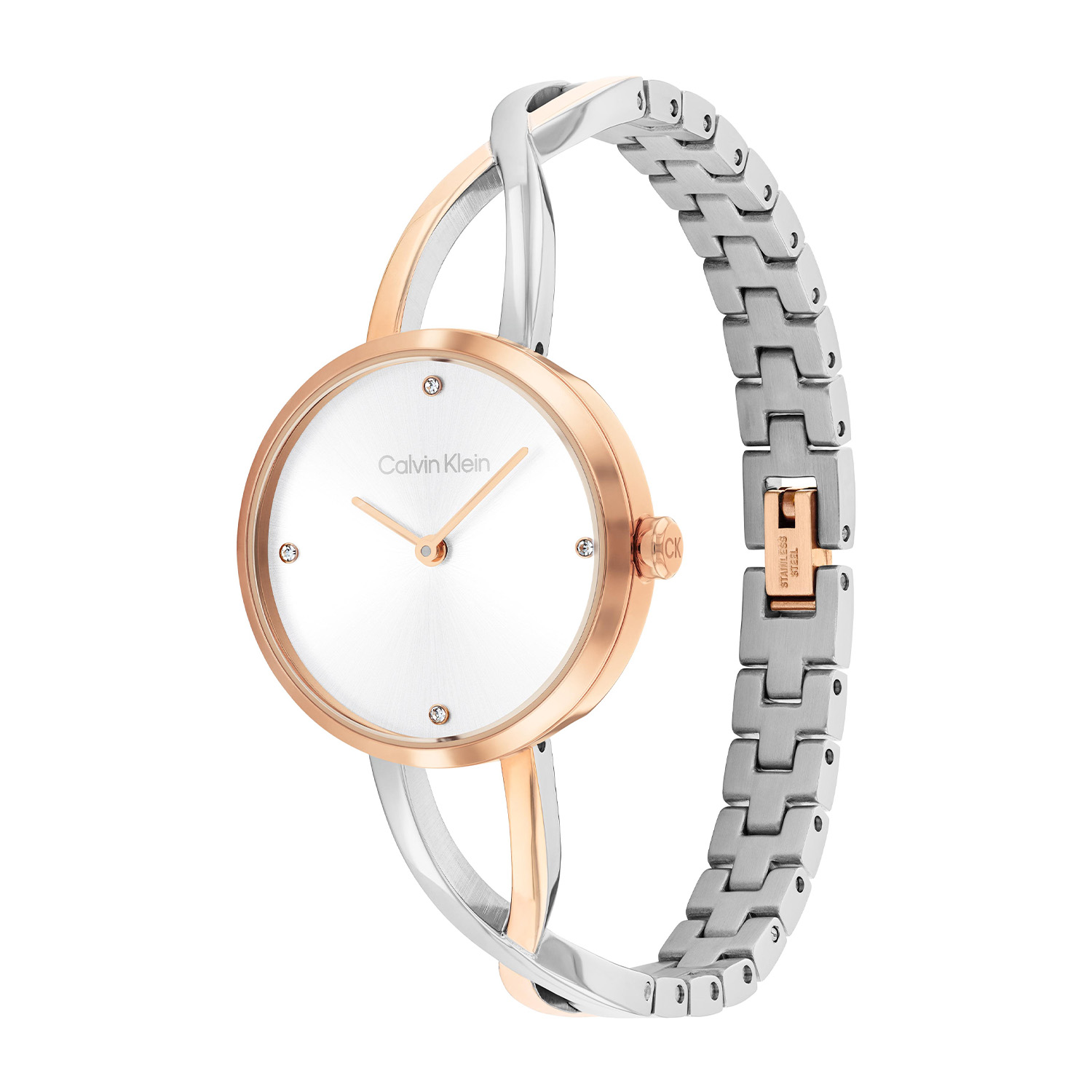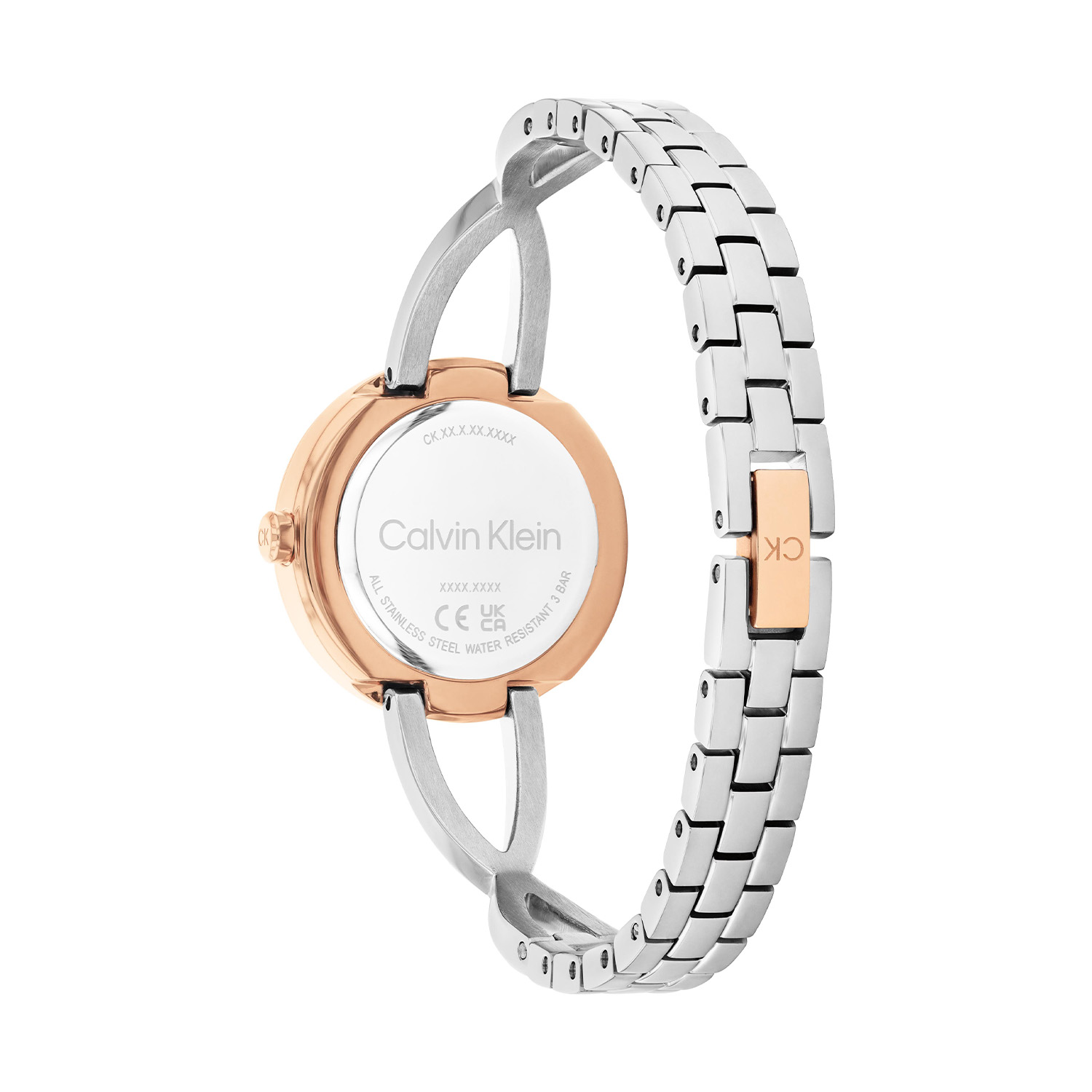 Dit Calvin Klein dameshorloge met nr CK25100060 is een klassiek ontwerp. De stijlvolle ronde stalen kast heeft een gladde goudkleurige bezel, een zilverwitte sunray wijzerplaat met fijne wijzers en op de 3,6,9 en 12 een kristal als uursaanduiding. Strak aan de kast zit een stalen fijne bicolor bangle band die uitloopt in schakels en daar te verstellen is op maat. Het elegante dameshorloge heeft een mineraalglas, een doorsnee van 28mm en is 3ATM.