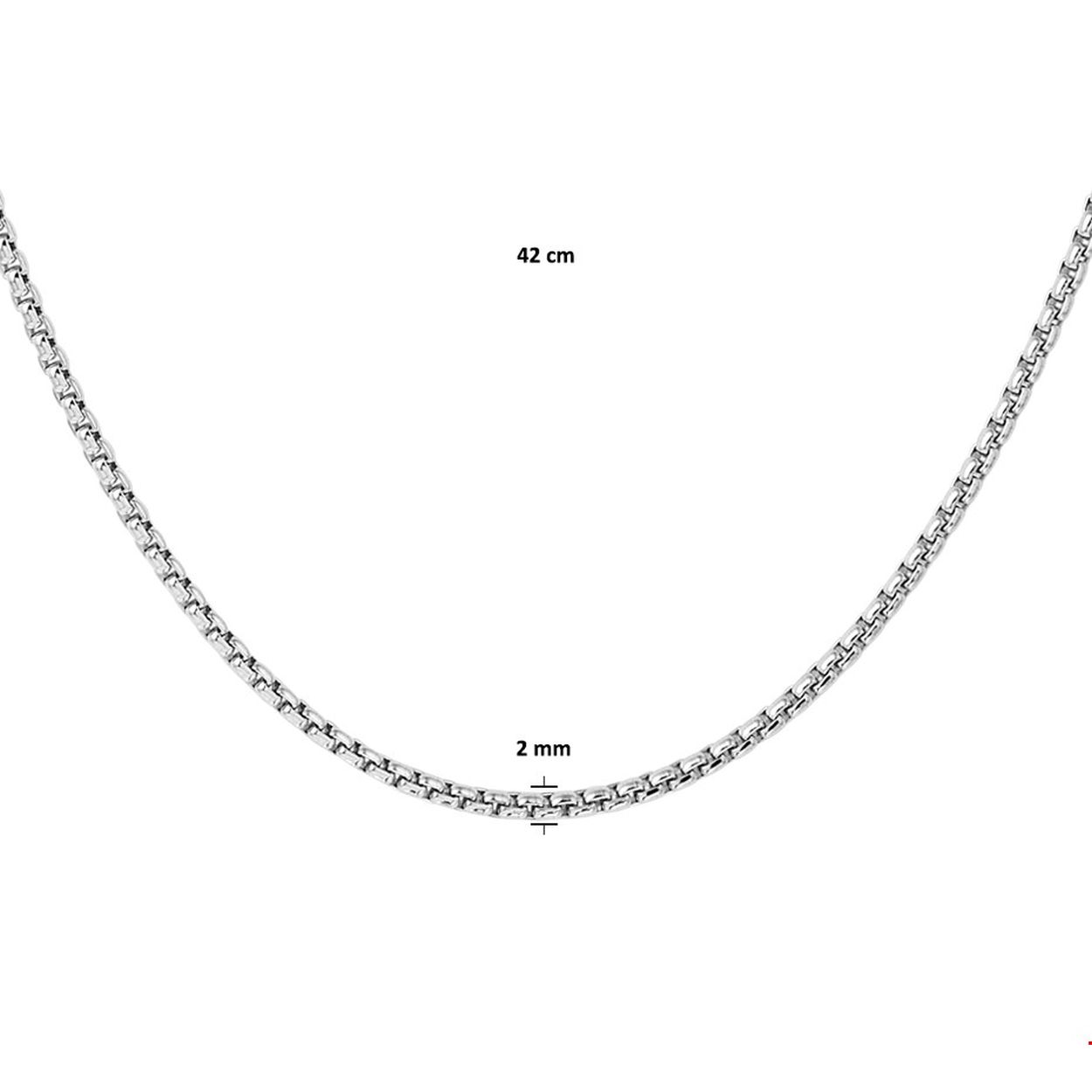 Beschrijving: Gerhodineerd zilveren collier met een venetiaanse schakel van 2mm. Het collier heeft een draaglengte van 42cm en is uitgevoerd met een stevige karabijn sluiting. Info: Gerhodineerd zilver is door de rhodiumlaag beter bestand tegen verkleuren en krassen.