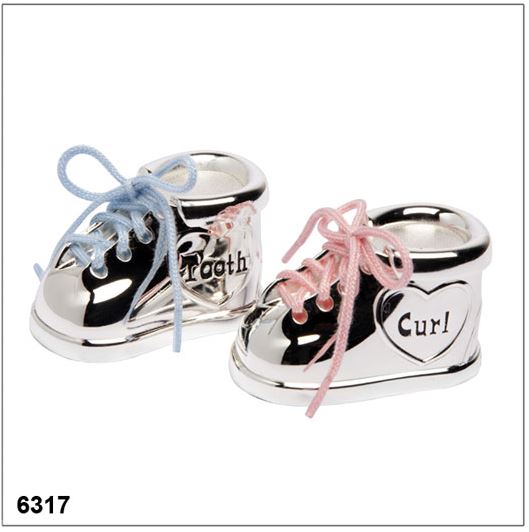 Set van twee tanden- en haarlokdoosjes in de vorm van schoentjes, met roze en blauwe veters. De tanden- en haarlokdoosjes zijn in zilver kleur, poetsen is overbodig.