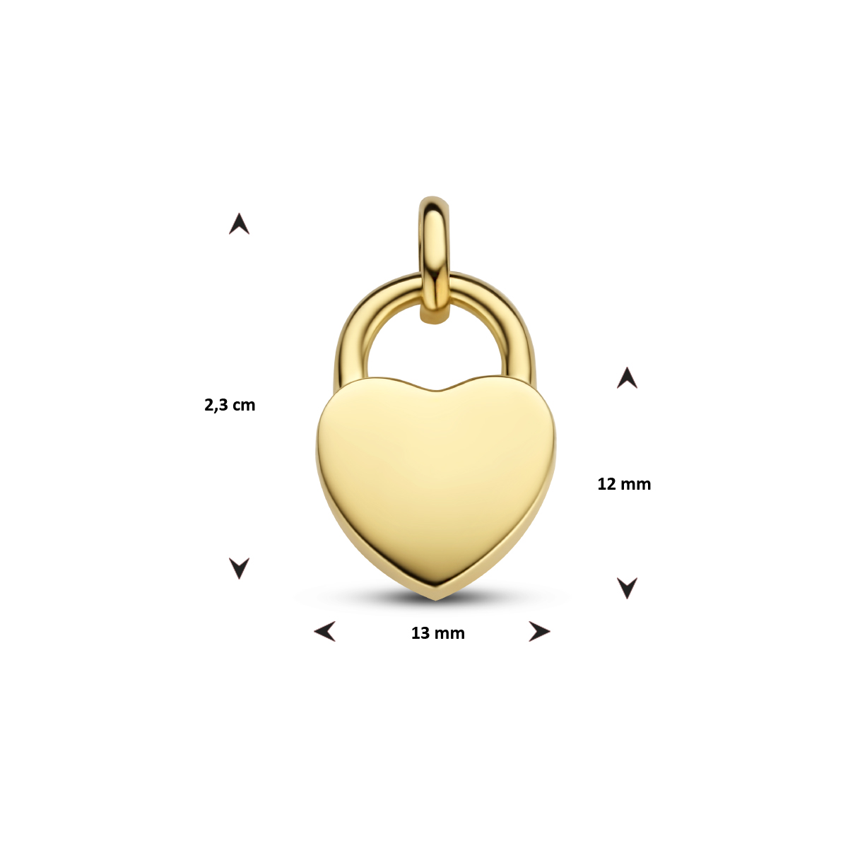 Geelgoud op 925 zilveren hanger in de vorm van een hartjes slot. Het hartje heeft een afmeting van 12x13mm. Geen garantie op plating.