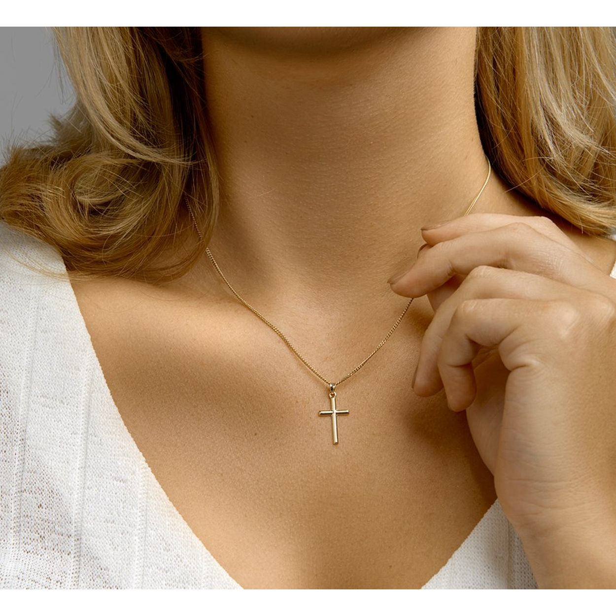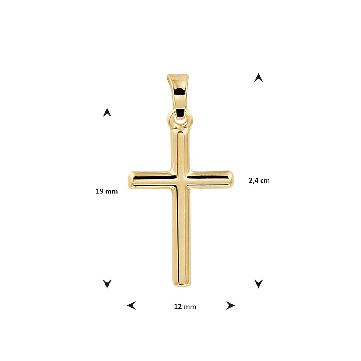 14k Geelgouden hanger uitgevoerd in de vorm van een kruis. De hanger heeft een totale hoogte van 2.4cm en een breedte van 12mm.