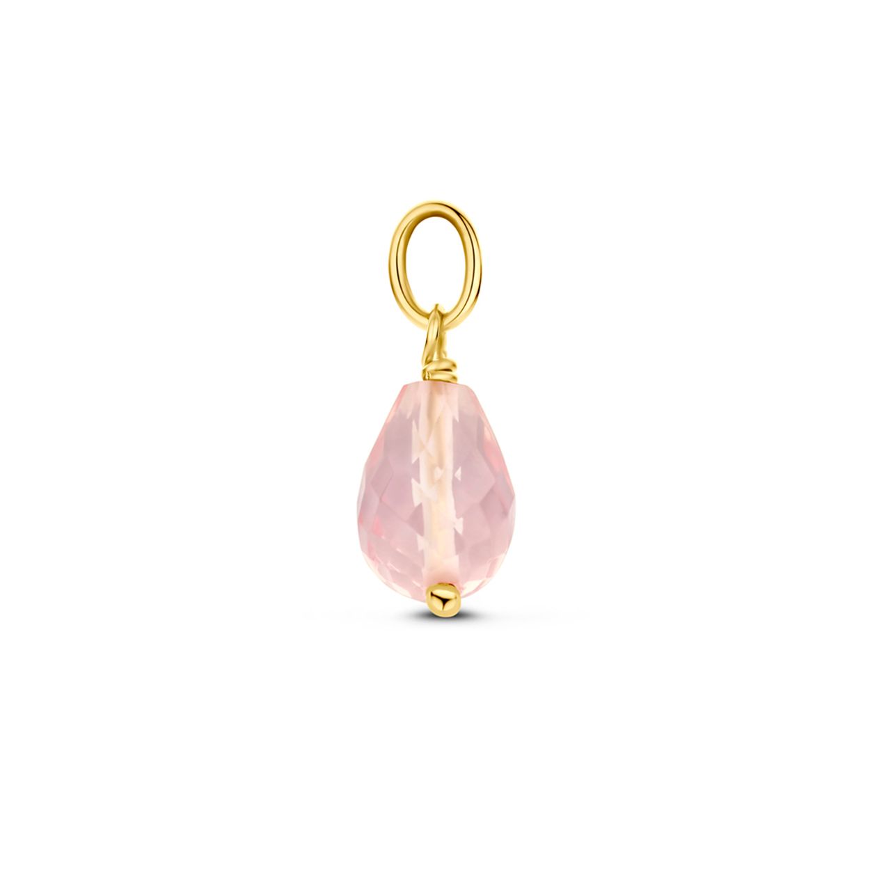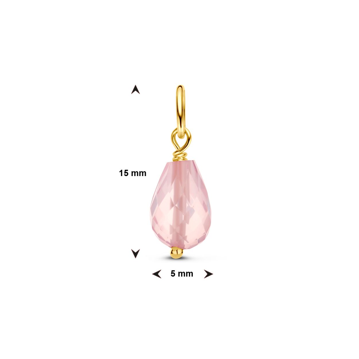 14k Geelgouden hanger uitgevoerd met roze kwarts. De hanger heeft een totale hoogte van 15mm.