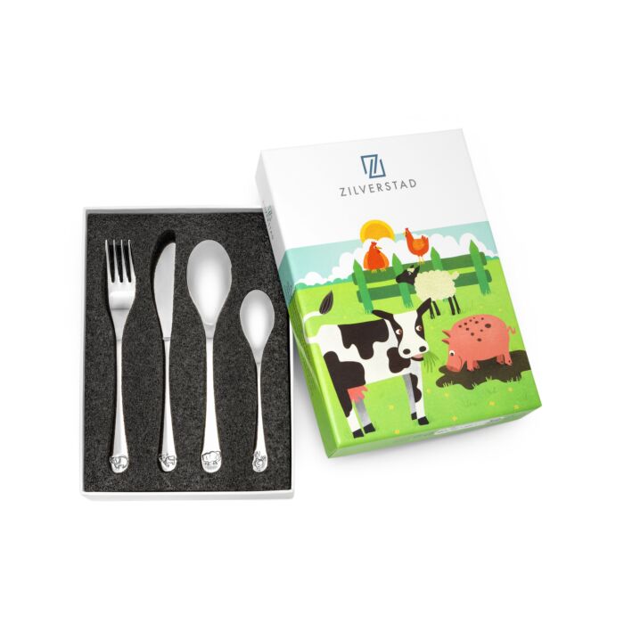 Eten wordt nog leuker met dit Zilverstad kindercouvert met boerderijdieren. De koe, het varken, het schaapje en de kip zorgen voor een feestje aan tafel. Het 4-delige bestekje is vervaardigd uit 18/10 RVS en kan in de vaatwasser. De bestekset wordt geleverd in een bijpassende geschenkverpakking. Het bestek is geschikt om gegraveerd te worden. Leuk als kraam- of verjaardagscadeau.