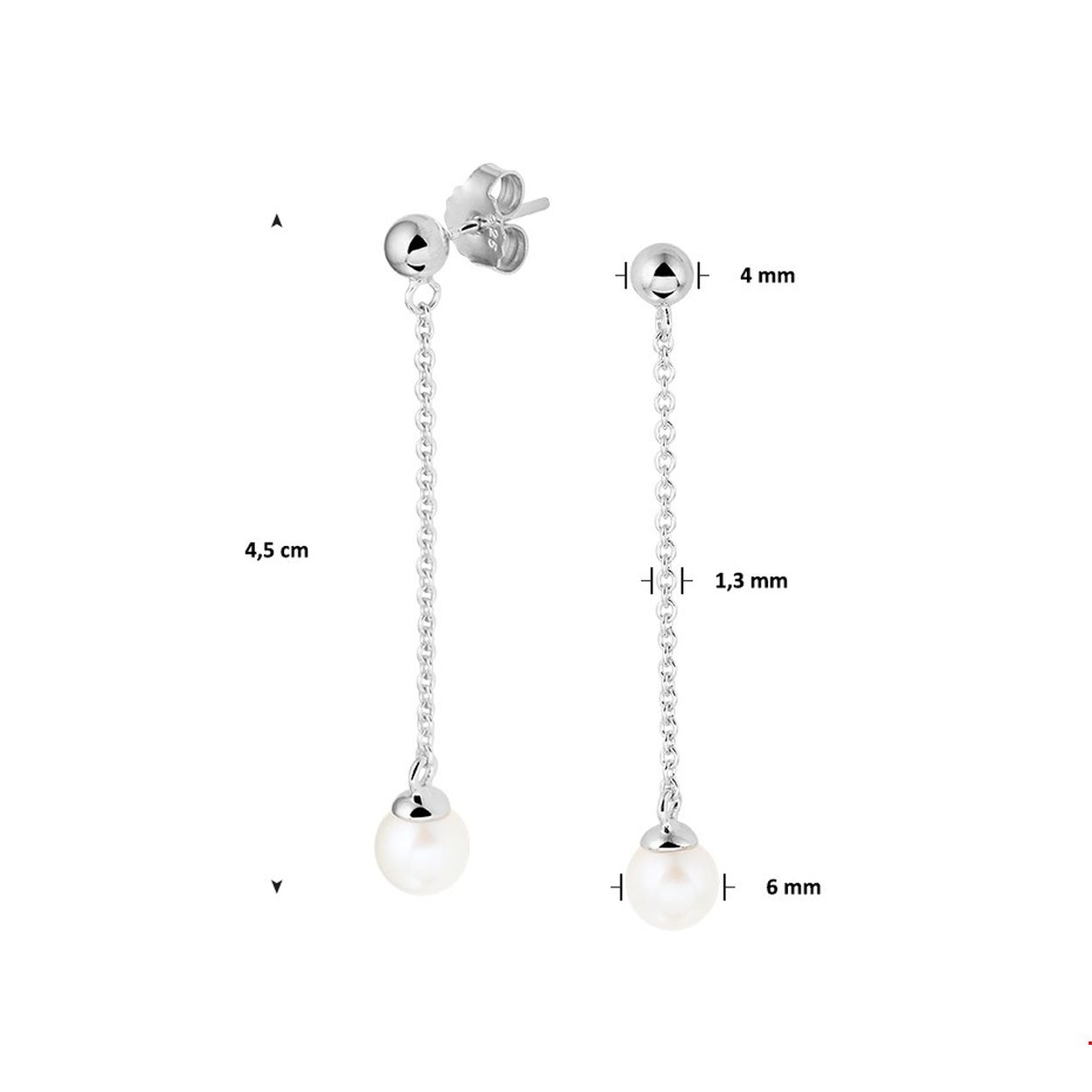 Gerhodineerd zilveren oorhangers met een totale lengte van 45mm. Uitgevoerd met een zoetwaterparel van 6mm en een poli afgewerkt bolletje van 4mm. De oorhangers zijn te combineren met bijpassende parel sieraden uit onze collectie.