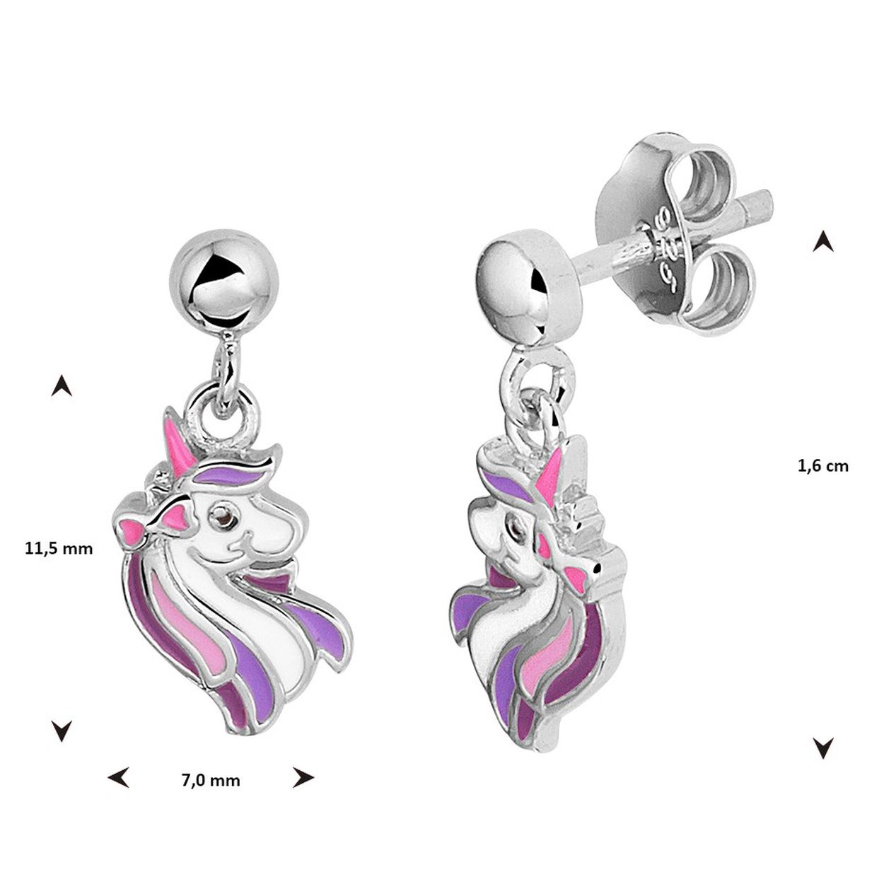 Gerhodineerd 925 zilveren oorhangers uitgevoerd met een eenhoorn. De oorhangers hebben een totale hoogte van 1.6cm en een breedte van 7mm.