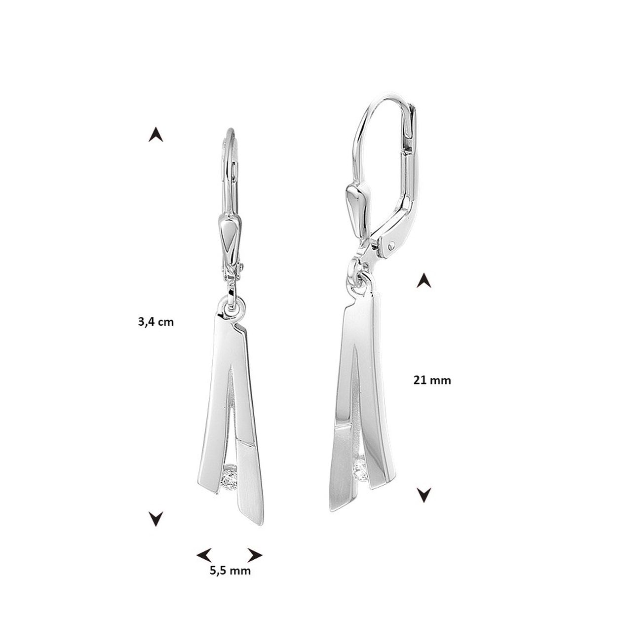 Gerhodineerd 925 zilveren oorhangers uitgevoerd met een schitterende zirkonia. De oorhangers hebben een totale hoogte van 3.4cm. De hanger heeft een afmeting van 21x5.5mm.