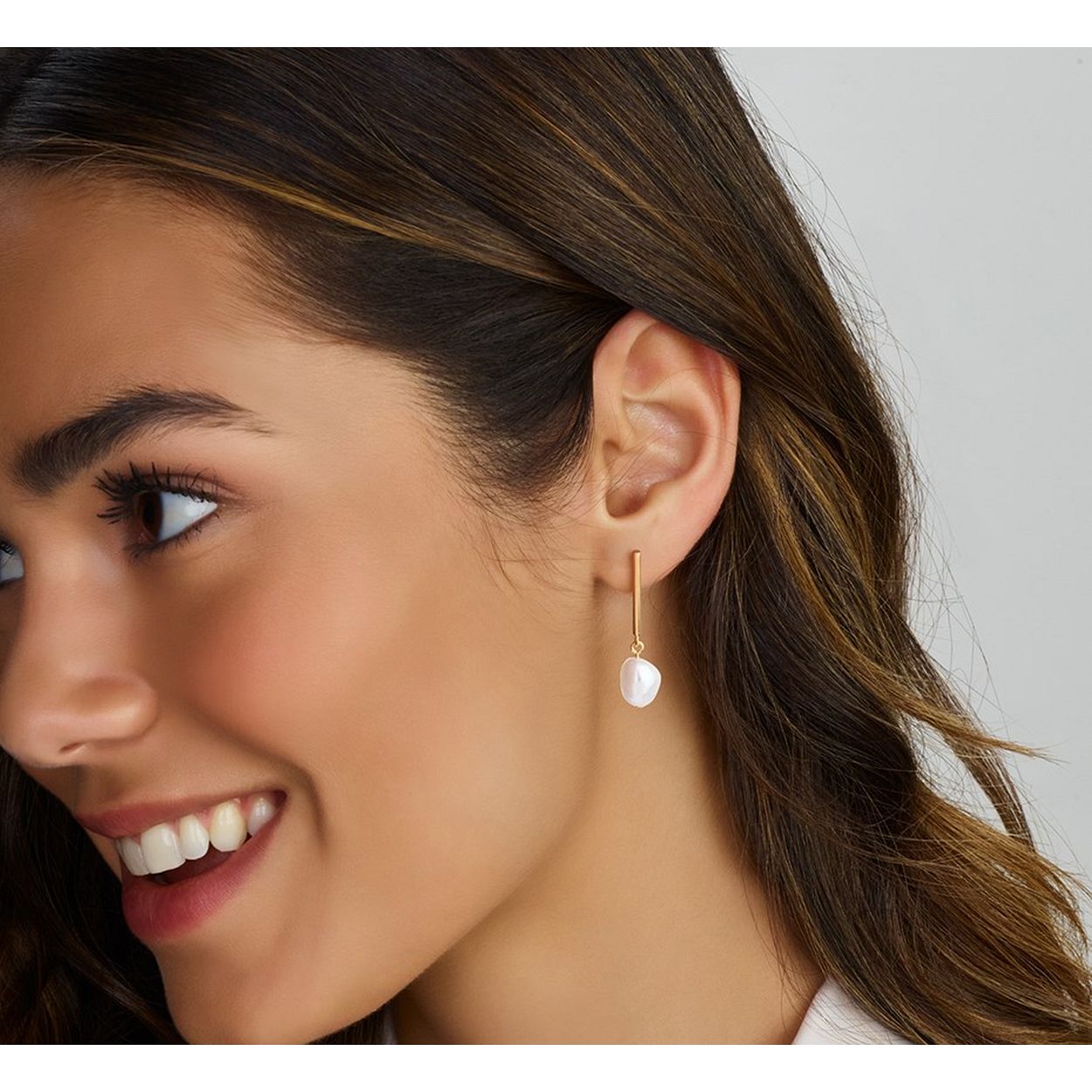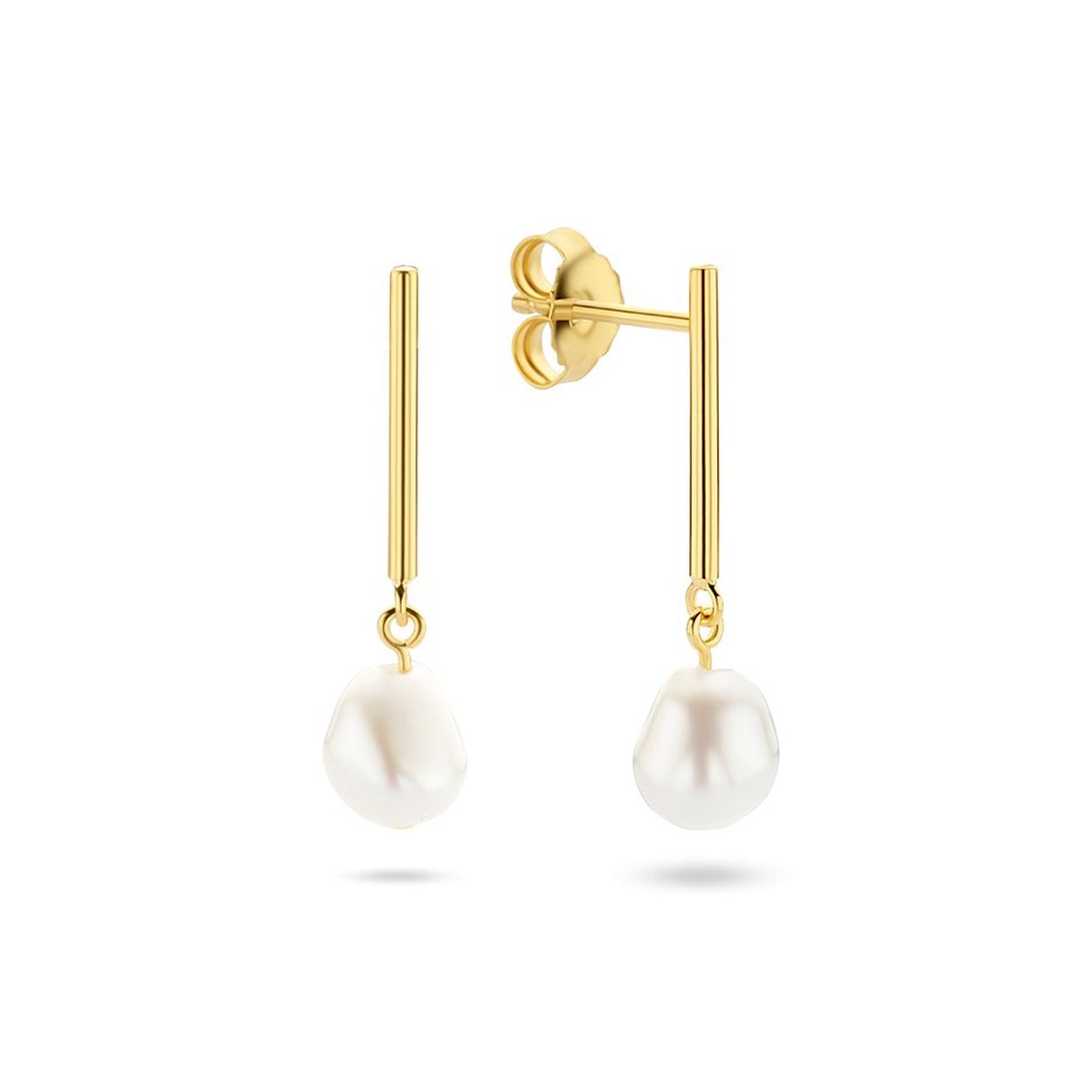 Geelgoud op 925 zilveren oorhangers uitgevoerd met een zoetwaterparel. De oorhangers hebben een totale hoogte van 2.5cm en een breedte van 6.5mm.