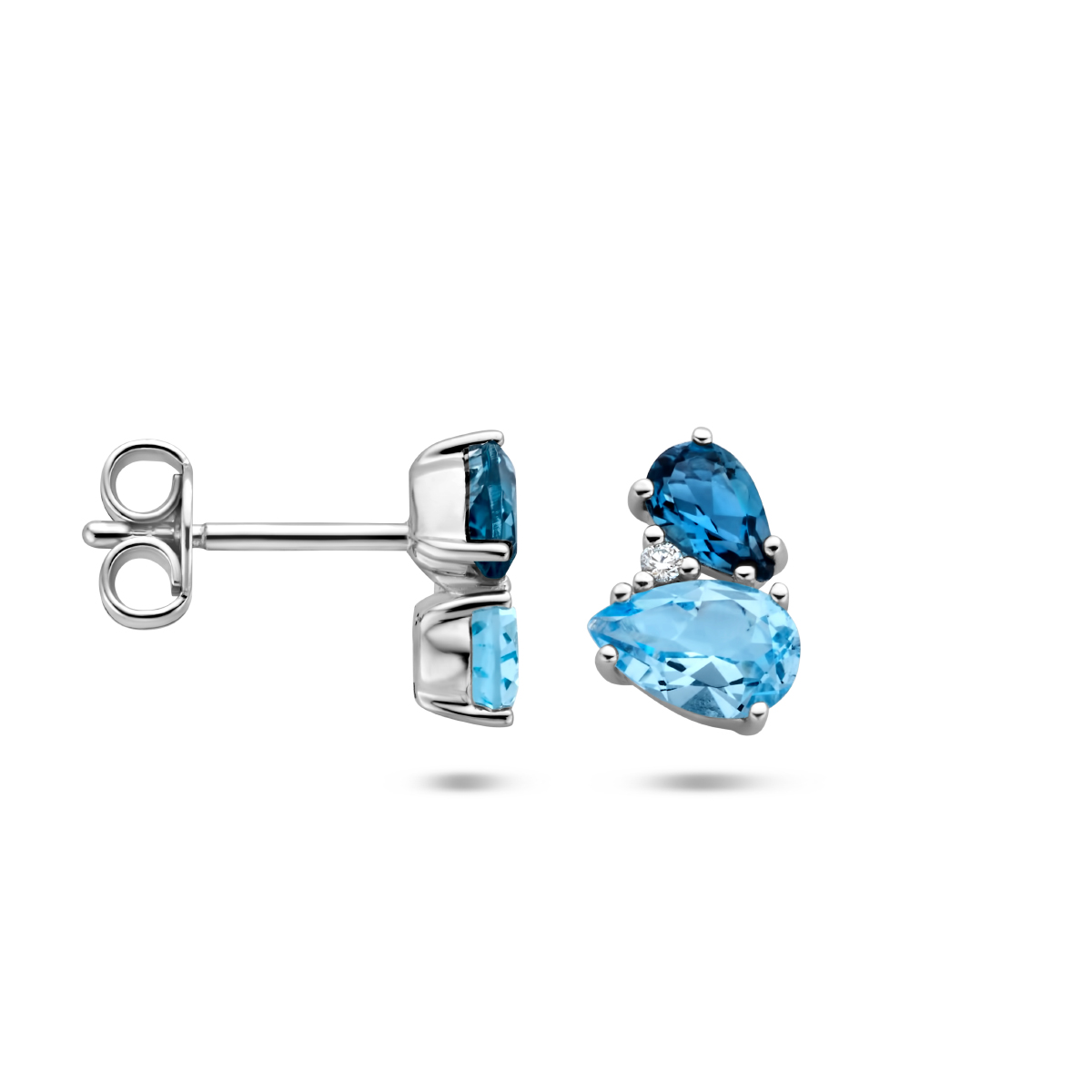 14k Witgouden oorknoppen uitgevoerd met schitterende diamant, london blue en blauw topaas.