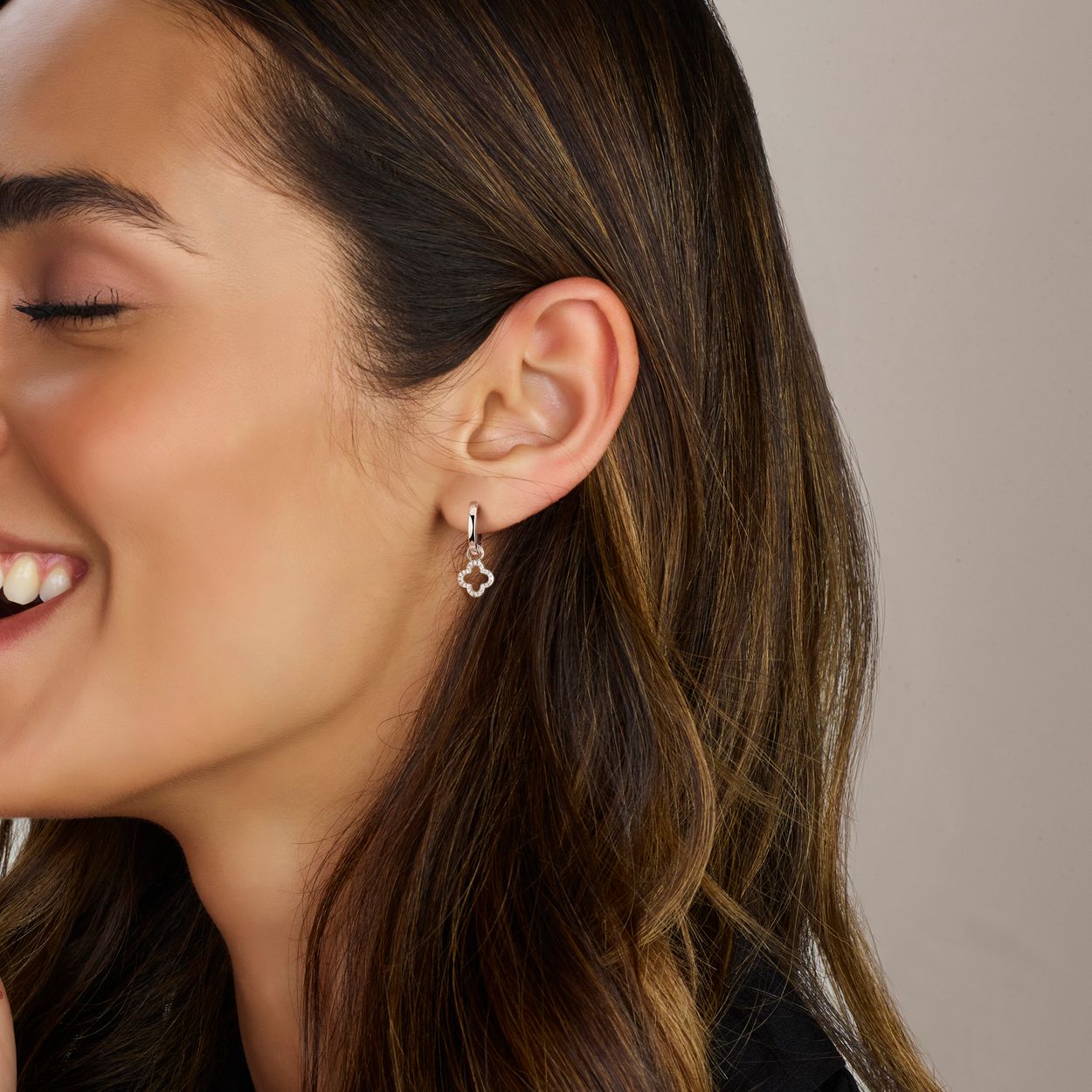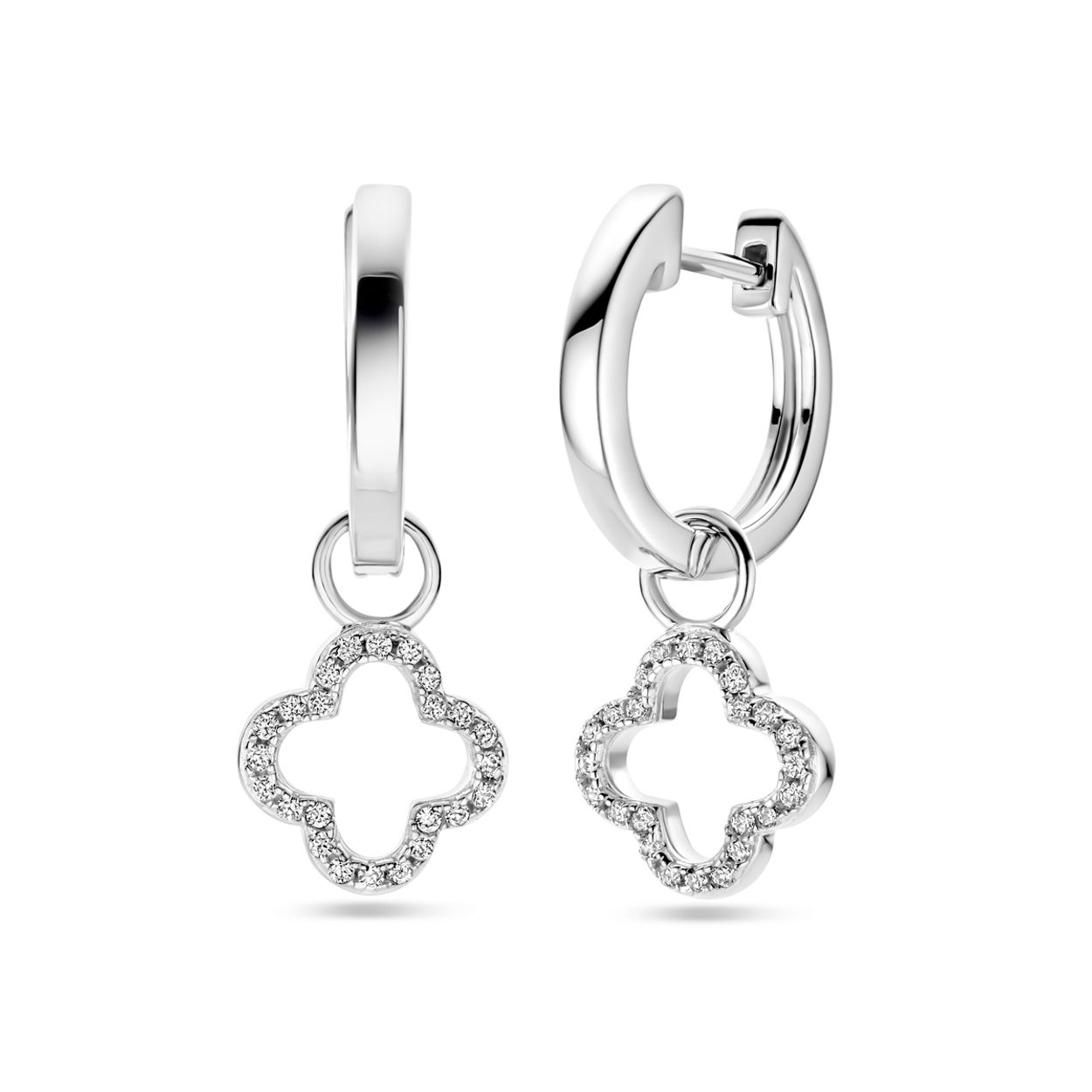 Gerhodineerd 925 zilveren oorringen in de vorm van een bloem uitgevoerd met zirkonia. De oorringen hebben een totale hoogte van 24mm.