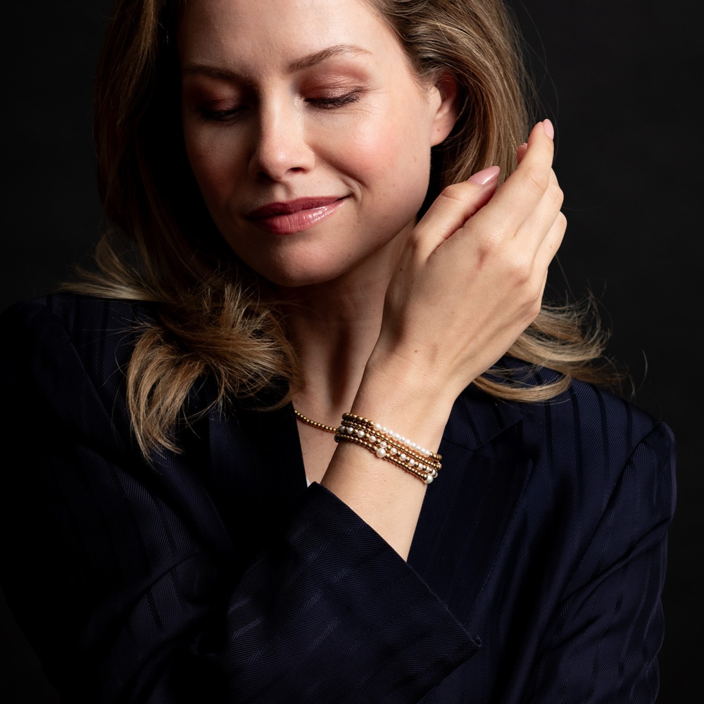 Armband van het merk Rebel & Rose. De armband heeft een hoogwaardige elastische stretch koord, met 4mm van Parels, RVS ion-gold plated.