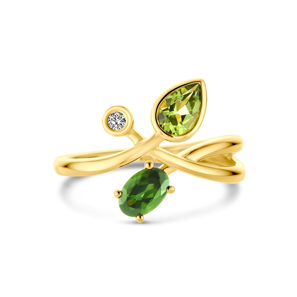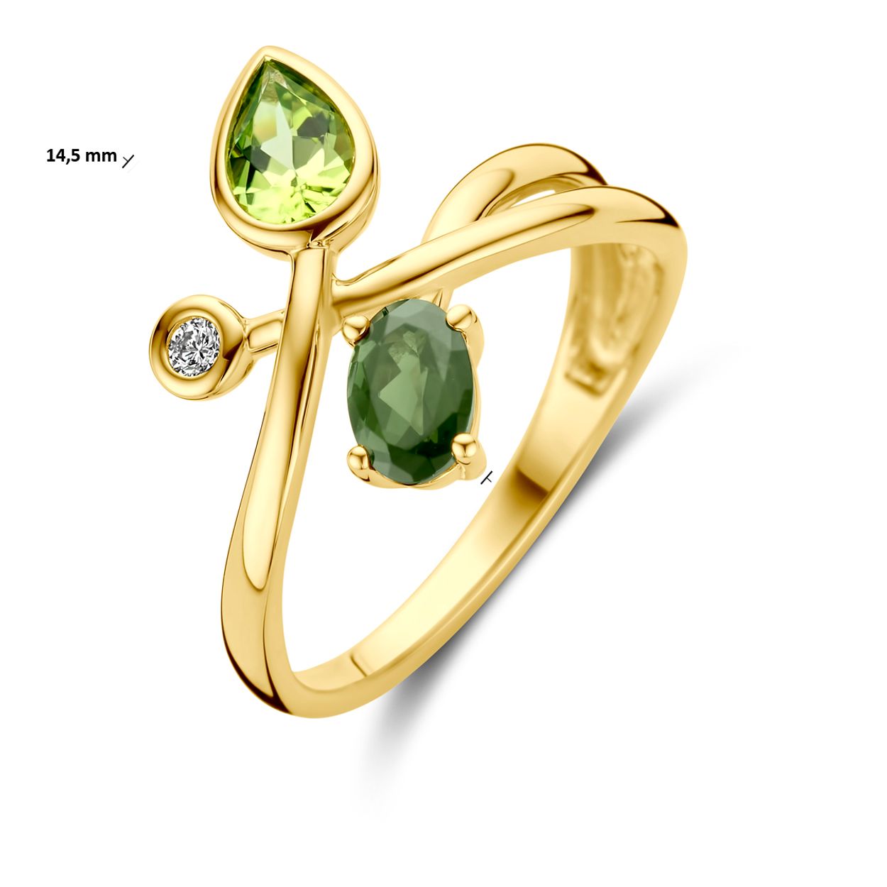 14k Geelgouden ring uitgevoerd met groen toermalijn, peridot en diamant. De ring heeft een breedte van 14.5mm. Het diamantgewicht is 0.03ct.