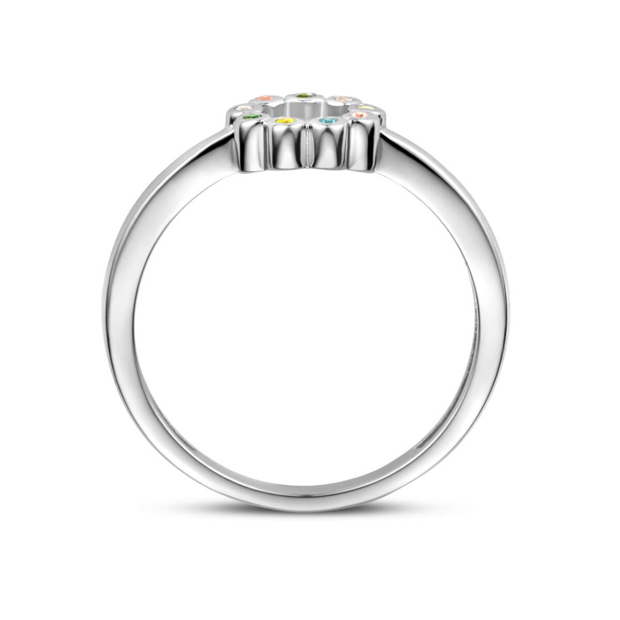 Gerhodineerd 925 zilveren ring uitgevoerd met gekleurde zirkonia. De ring heeft een breedte van 7.5mm.