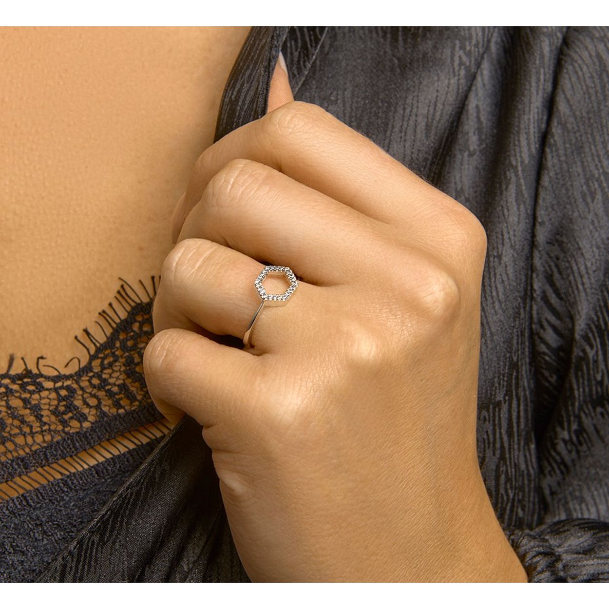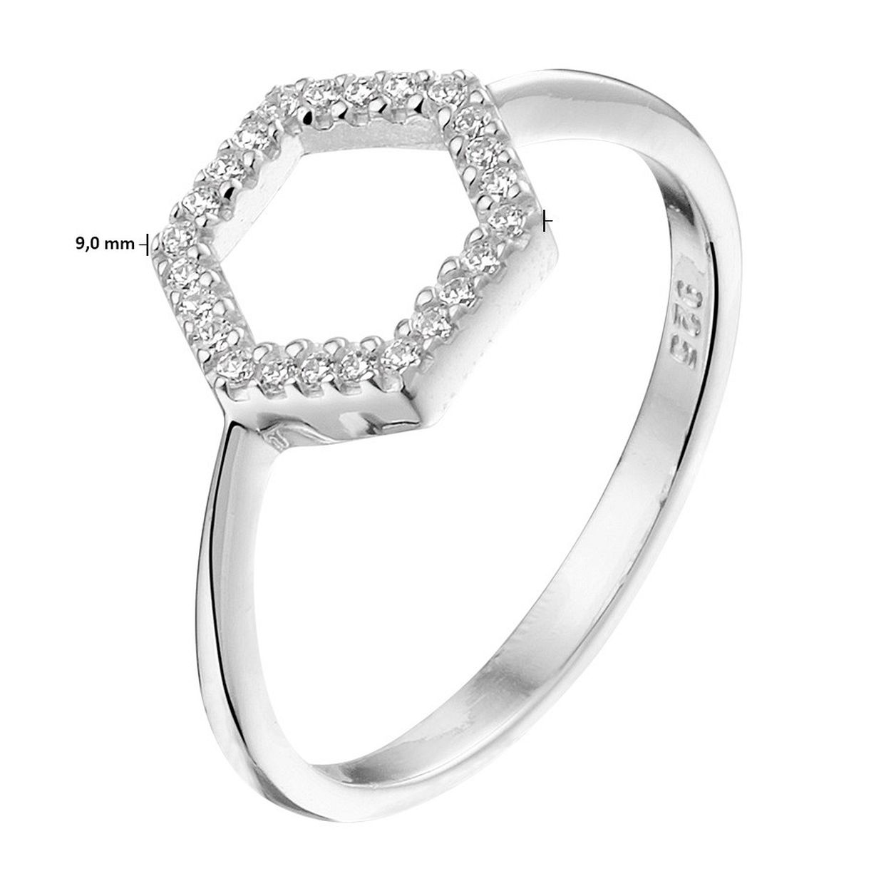 Gerhodineerd 925 zilveren ring uitgevoerd met een zeshoek en een schitterende zirkonia rij. De ring heeft een breedte van 9mm.