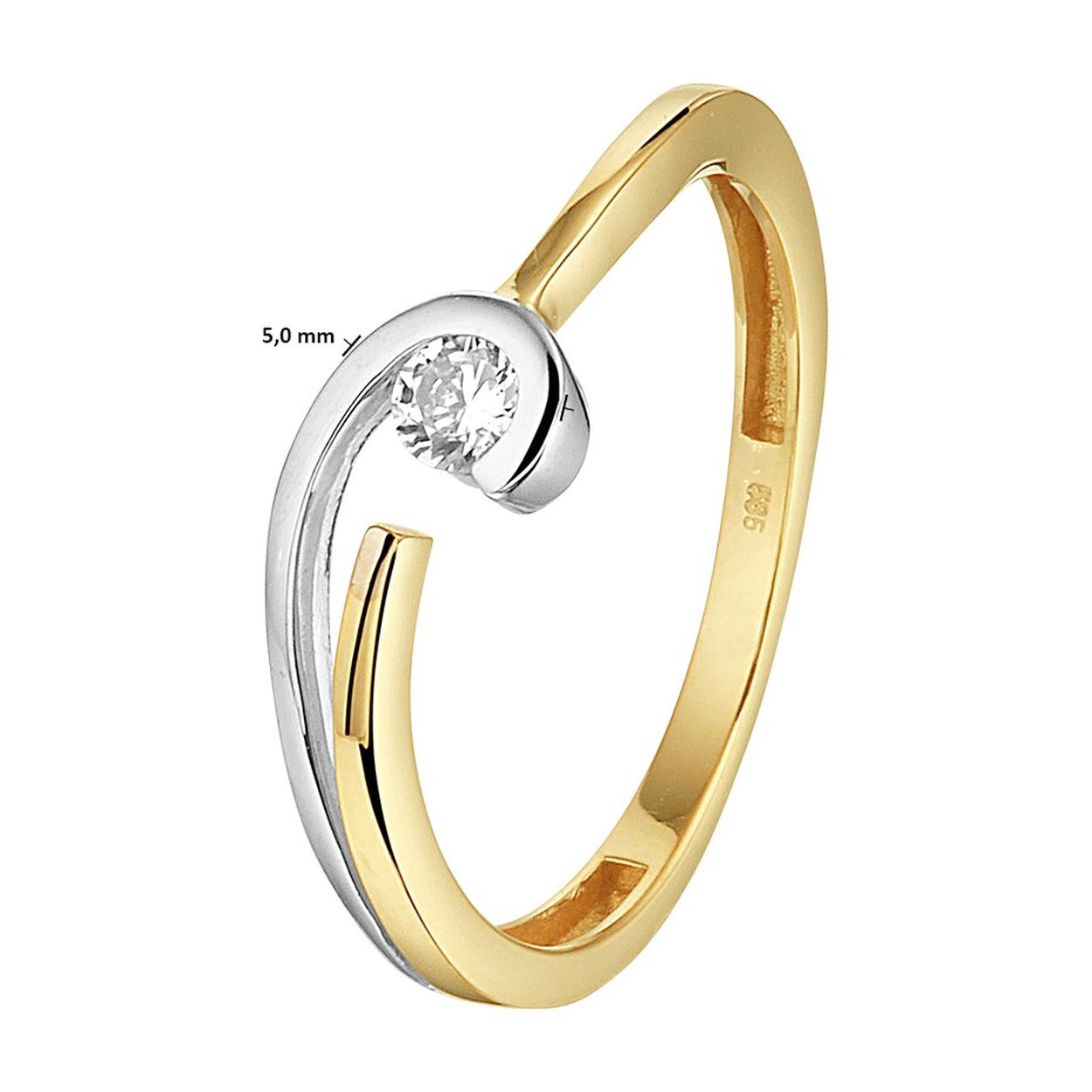 14k Bicolor geel- en witgouden ring uitgevoerd met een heldere zirkonia. De ring heeft een breedte van 5mm.