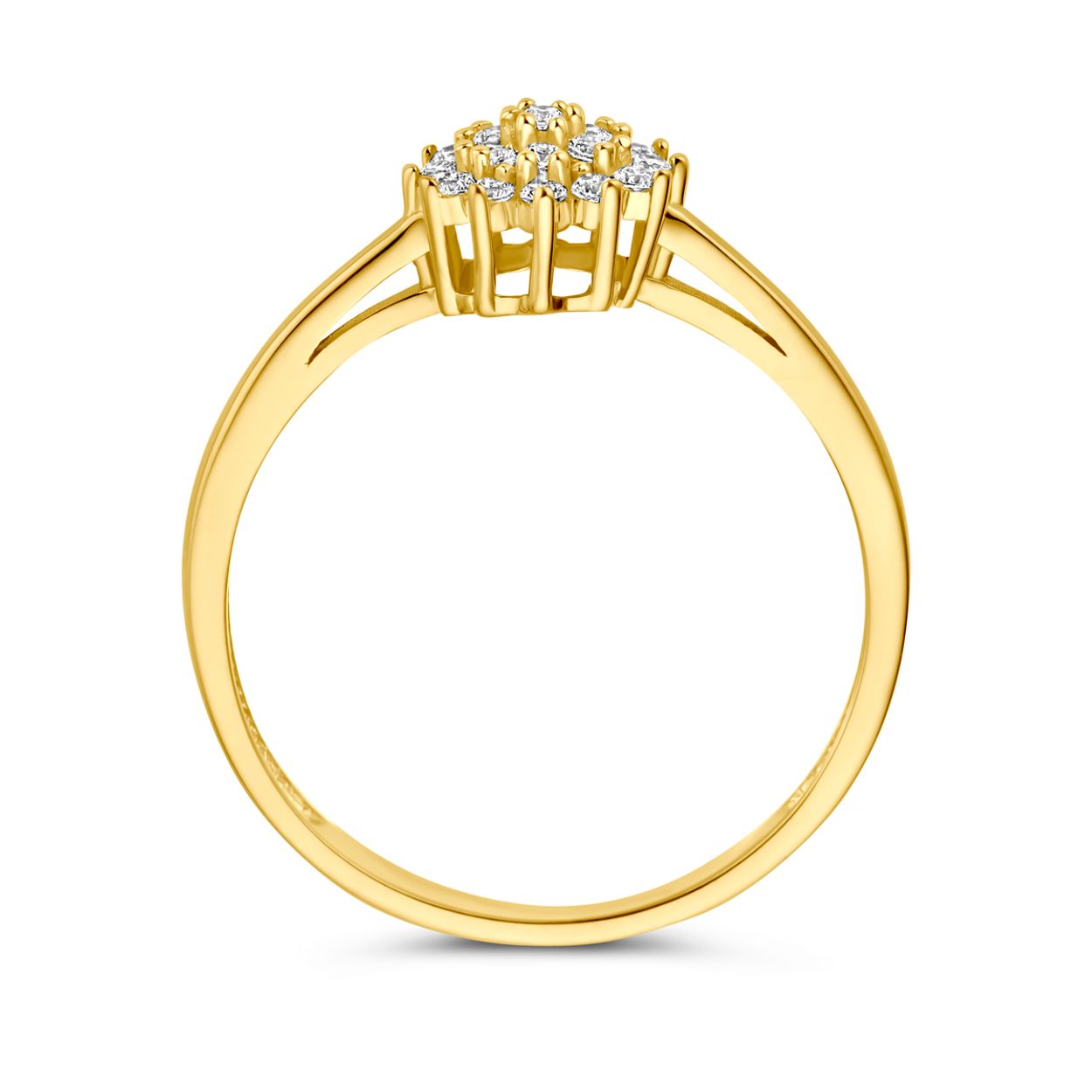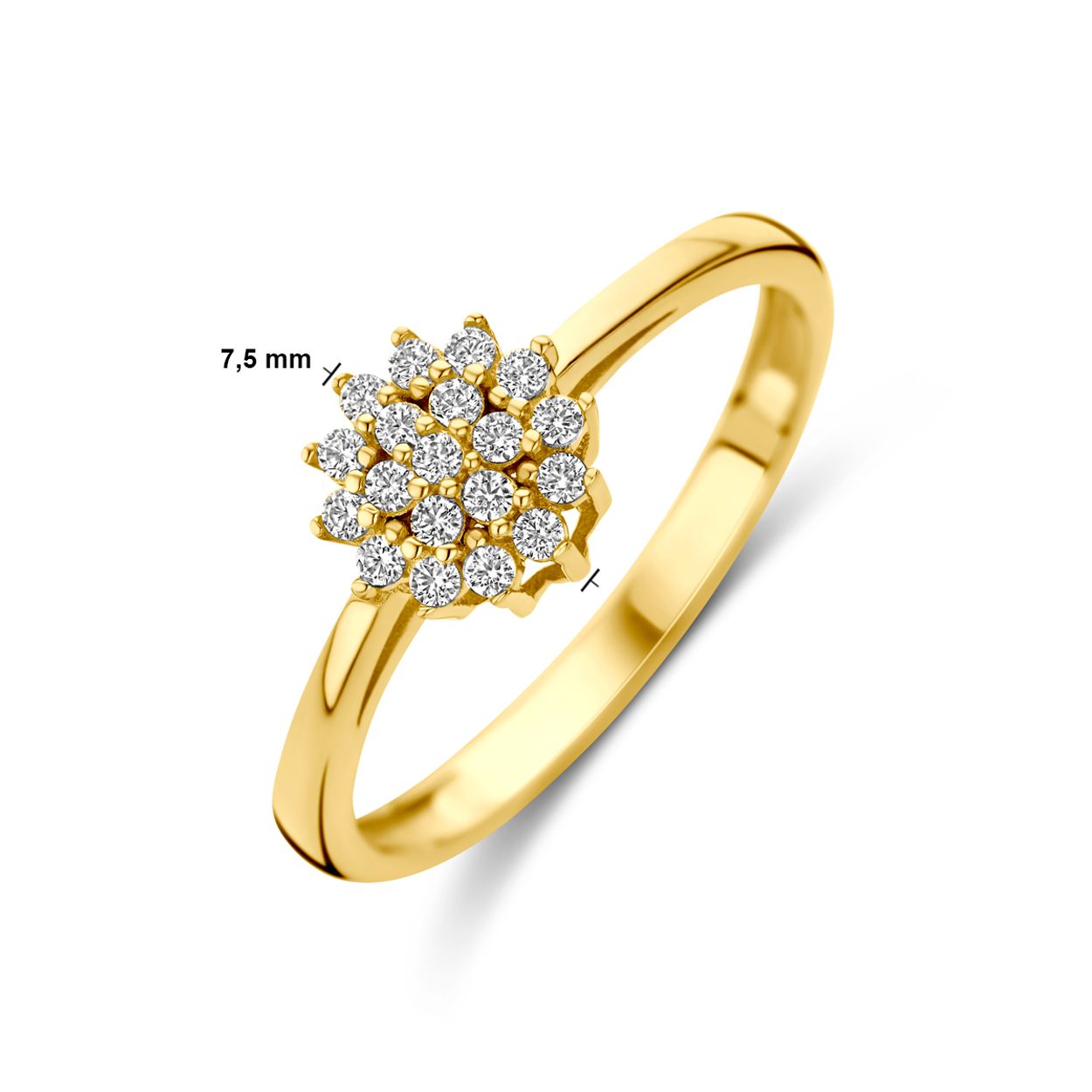 14k Geelgouden ring uitgevoerd met zirkonia. De ring heeft een breedte van 7.5mm.