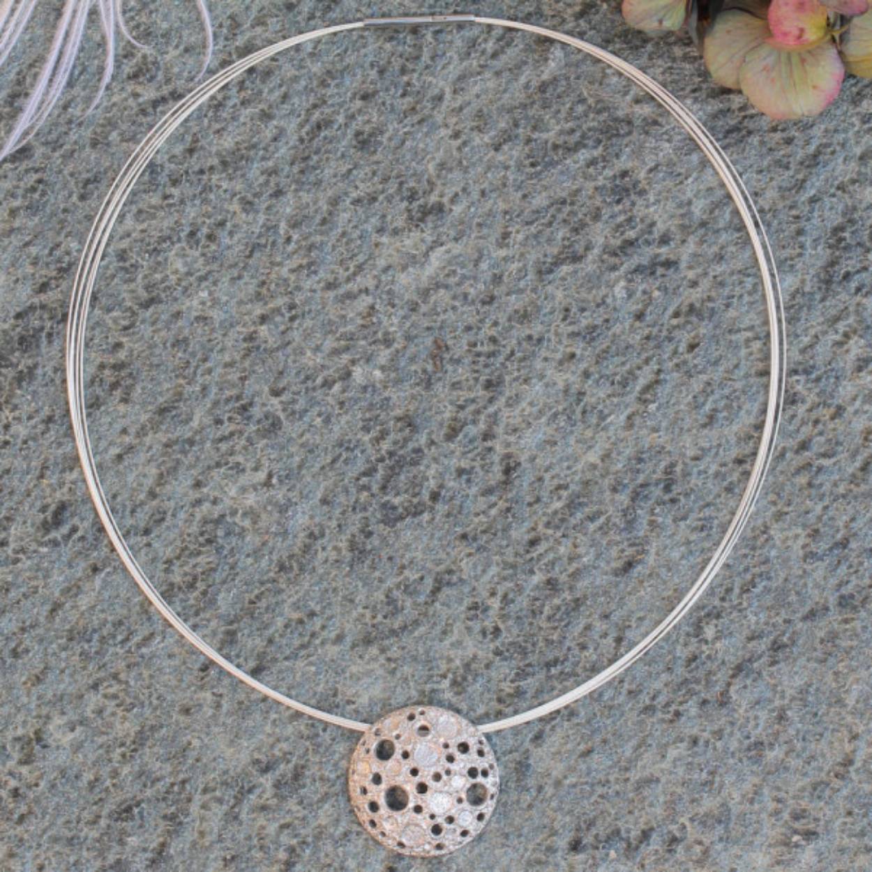 Bijzondere ronde en zilveren hanger van sterling zilver, doorsnee 3,5cm, zonder ketting. De hanger heeft kleine en grotere gaatjes die mooi schitteren door de diamantering. Een bijpassende armband, oorbellen en ring zijn ook verkrijgbaar. Het afgebeelde collier (TA0519003.45) kost €89,-
