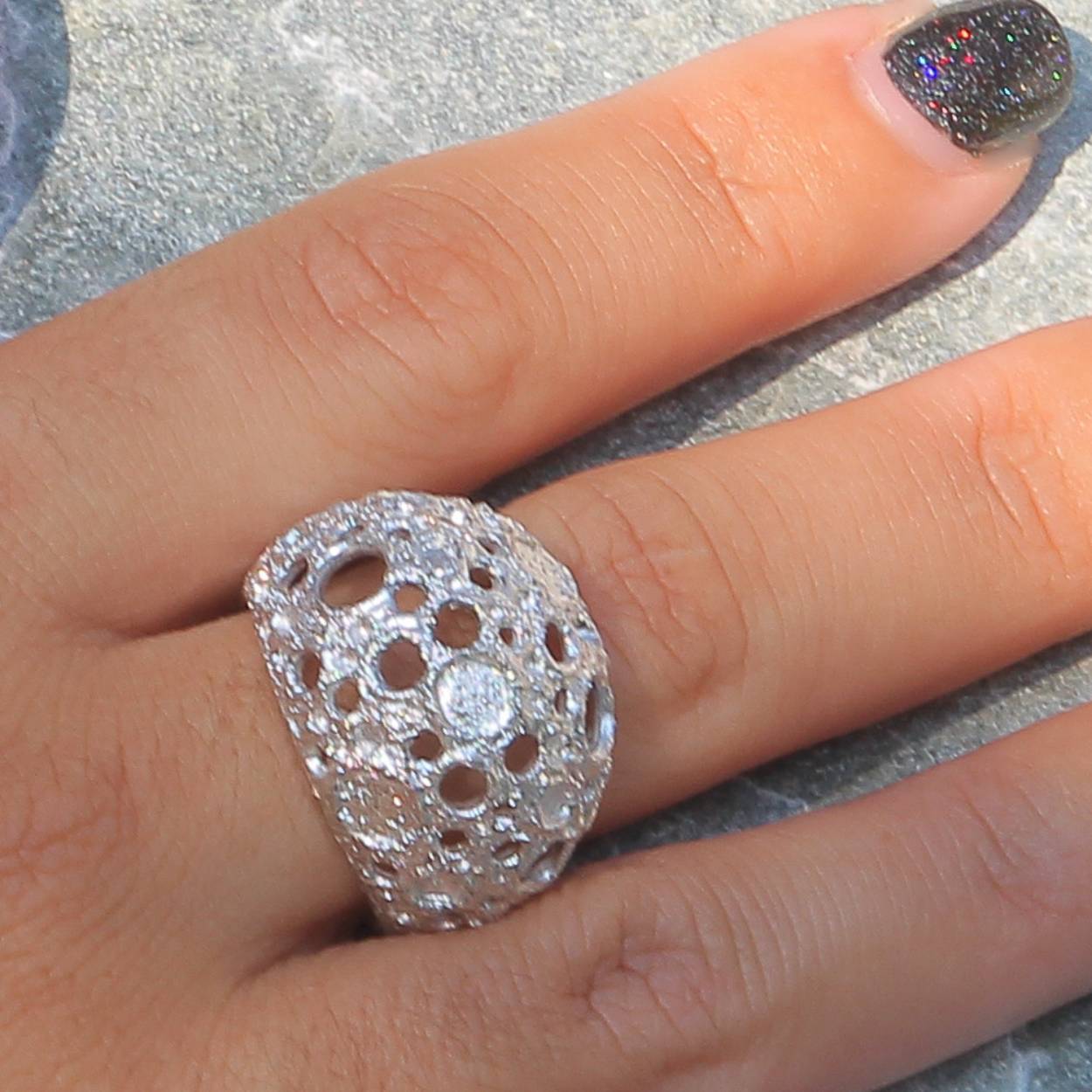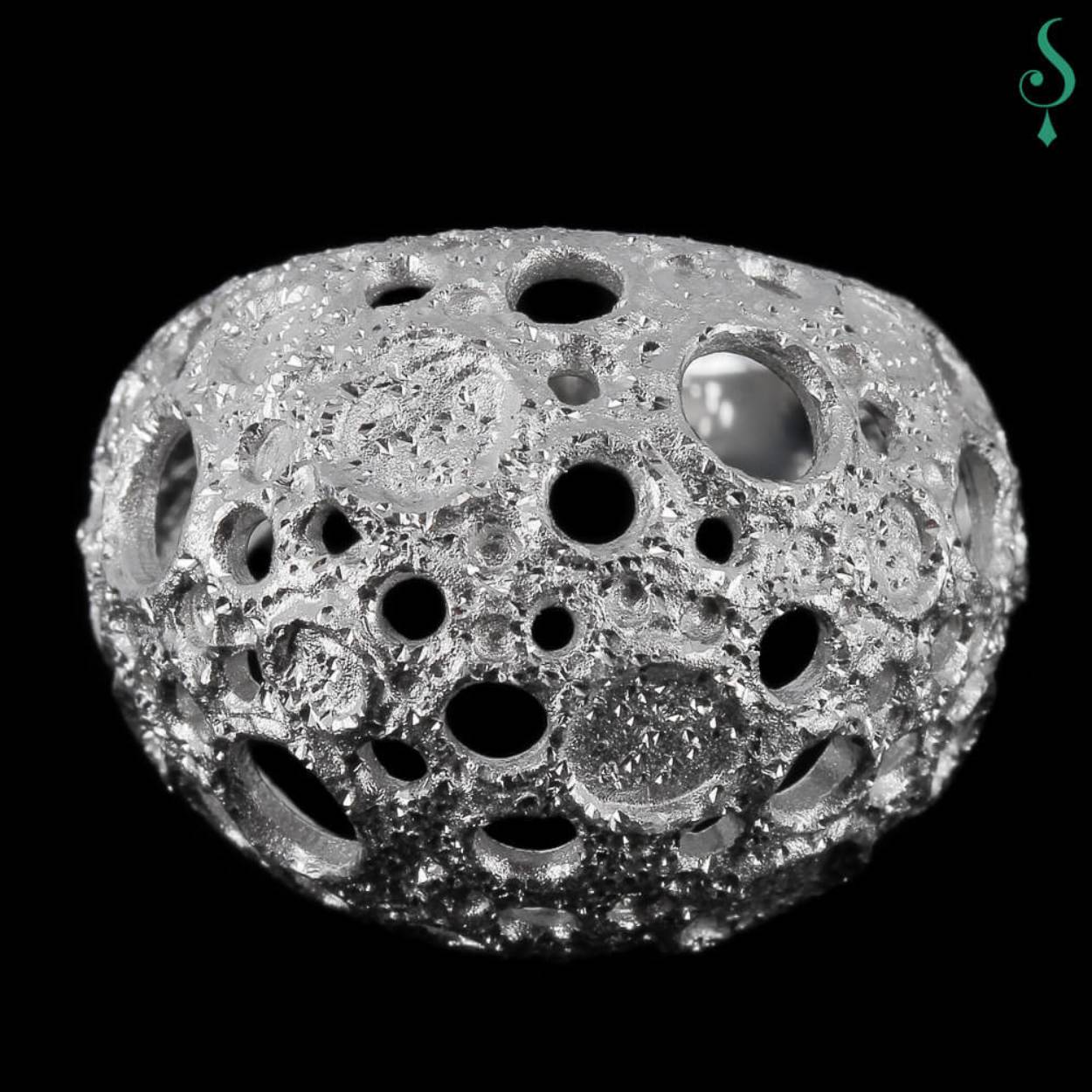 Zilveren ring van Sanjoya uit de serie Londen, bolvormig met open cirkels. Bijpassende hanger en oorsieraden zijn verkrijgbaar.