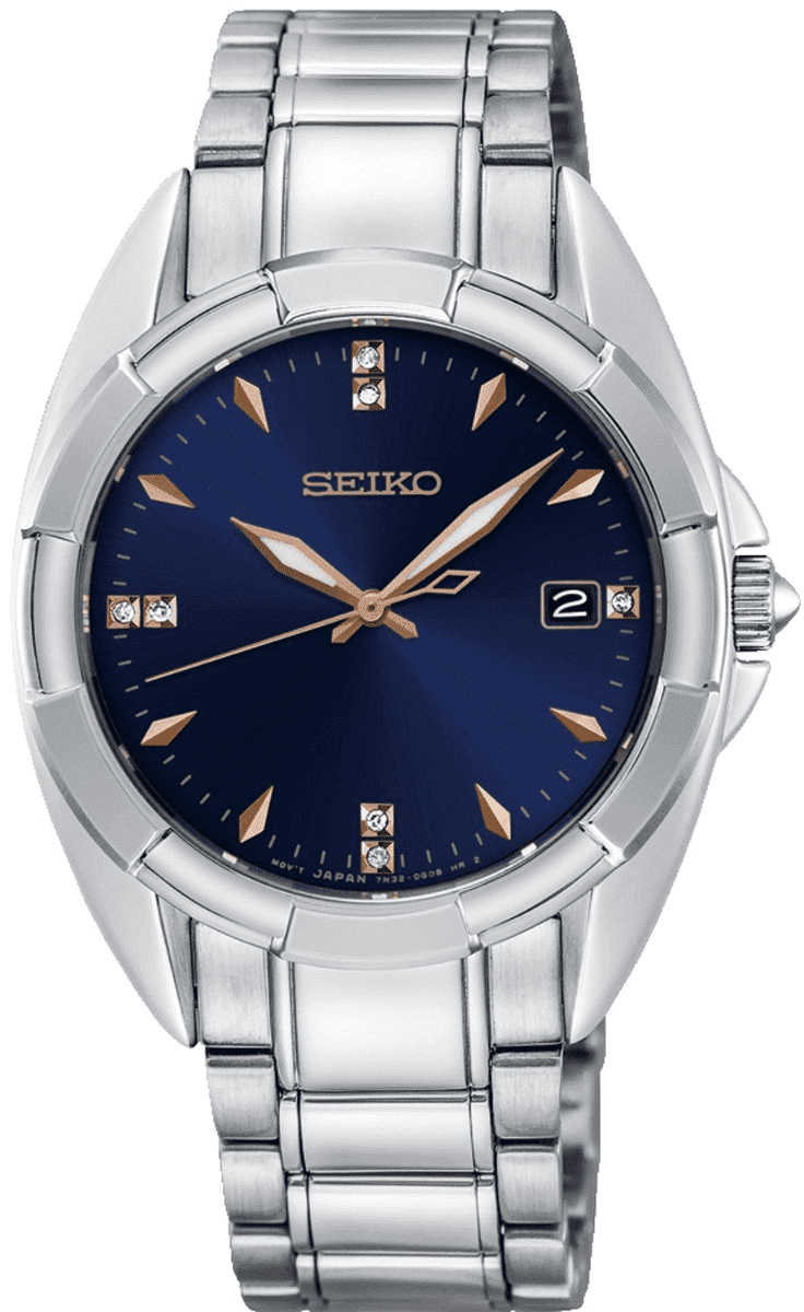 Dit Seiko dameshorloge is van edelstaal en heeft een quartz uurwerk waarop de tijd analoog wordt weergegeven op een blauwe wijzerplaat.