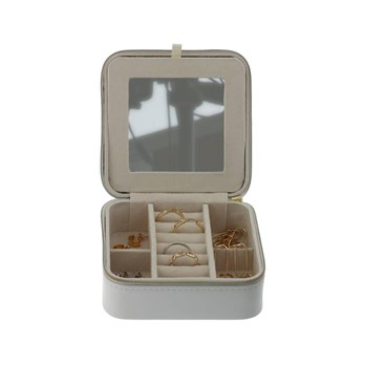 Luxe sieradenbox in de kleur wit uitgevoerd met een goudkleurige rits sluiting, een klein spiegeltje, verschillende vakjes en een extra vakje achter het spiegeltje. Een compacte box om verschillende sieraden in op te bergen.
