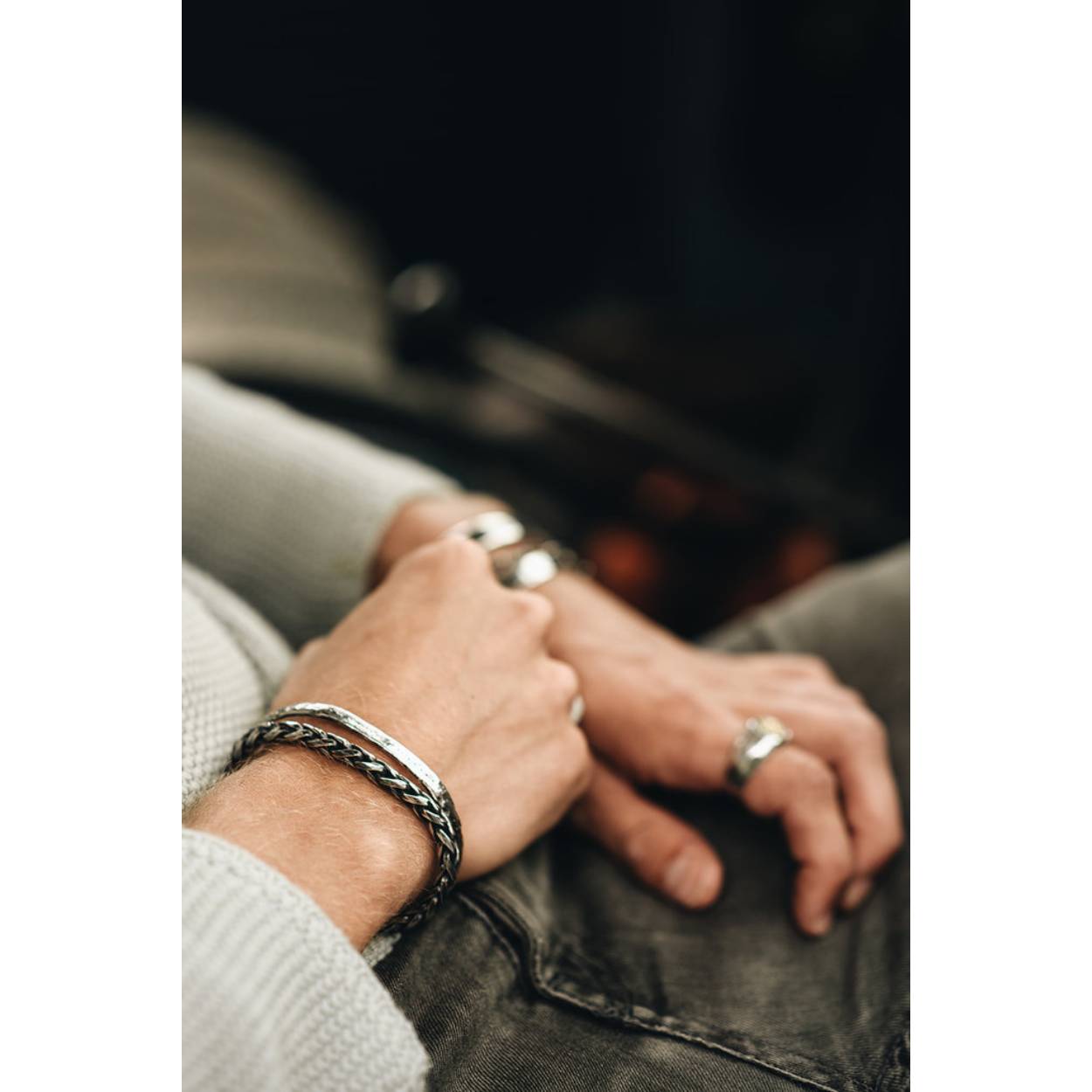 Rustieke armband met geoxideerde en geslagen details. De Karst-cuff heeft een contrasterend en licht gepolijst oppervlak waarin in morsecode ‘Live Free’ met de hand gegraveerd is. Draag alleen of met andere armbanden.