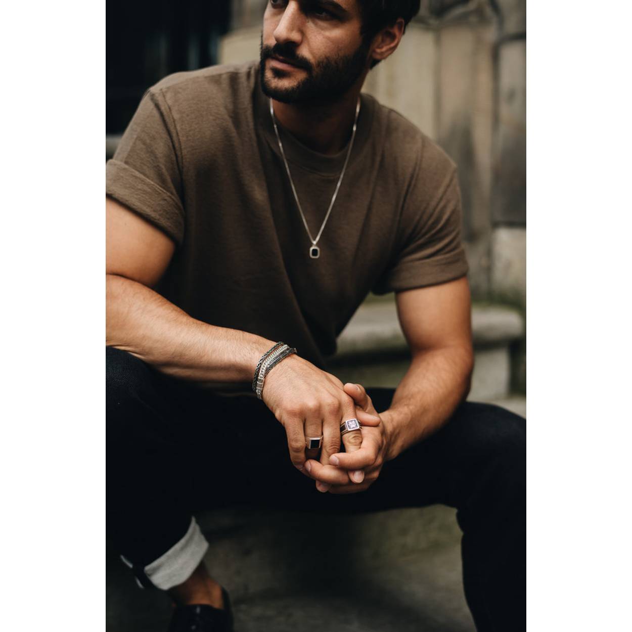 Met zijn zwaar geoxideerde zijkanten en contrasterend snijwerk is deze ring een echt statement piece. Op de voorkant staat een West-Afrikaans Adinkra-symbool dat staat voor kennis.