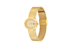 Dit specifieke horloge van Tommy Hilfiger uit de Moira serie met artikelnr: TH1782847 is een casual dameshorloge die niet in je collectie mag ontbreken. Het stalen goudkleurige dameshorloge heeft een ovale kast met een gladde rand met daarin de naam Hilfiger gegraveerd. Op de goudkleurige geborstelde sunray wijzerplaat zijn de Romeinse 12 en 6 en kristallen duidelijk aanwezig. Vanuit de kast loopt een fijne goudkleurige milanese band met een druksluiting. Het horloge heeft een mineraalglas, een afmeting van 25x22mm en is 3ATM.
