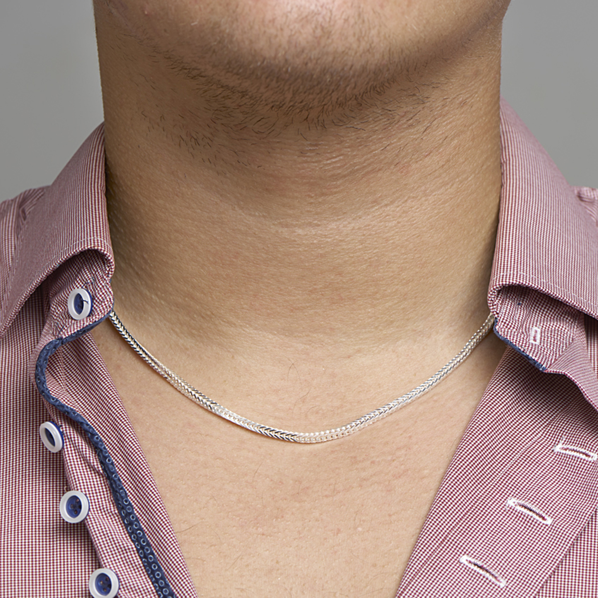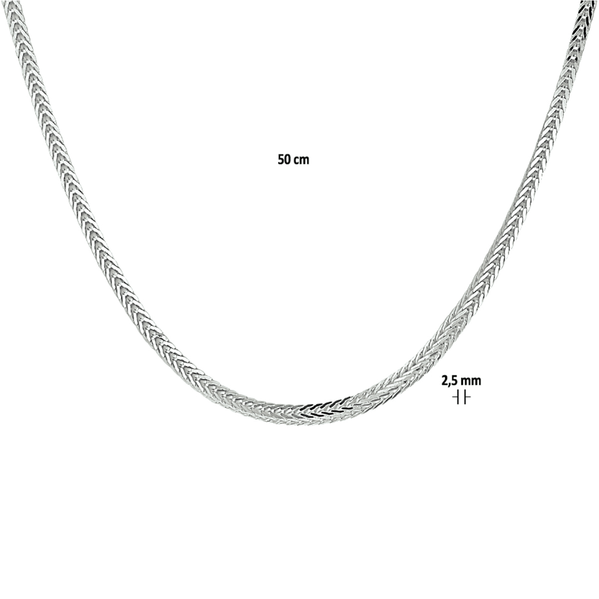 Zilveren lengte artikel met een vossestaart schakel. Het lengte artikel heeft een schakelbreedte van 2.5mm. Uitgevoerd met een karabijn sluiting.