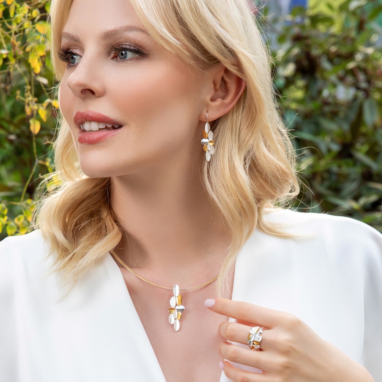 "Glittertind Collection" - een nieuwe, opvallende designlijn van de Noorse ontwerpster Kaja Gjedebo. Talrijke individuele decoratieve elementen van tweekleurig 925/- sterlingzilver en een zandmat oppervlak, die op bladeren lijken, vormen samen dit vrouwelijke designsieraad. Ideaal als set met bijpassende ring en oorbellen.