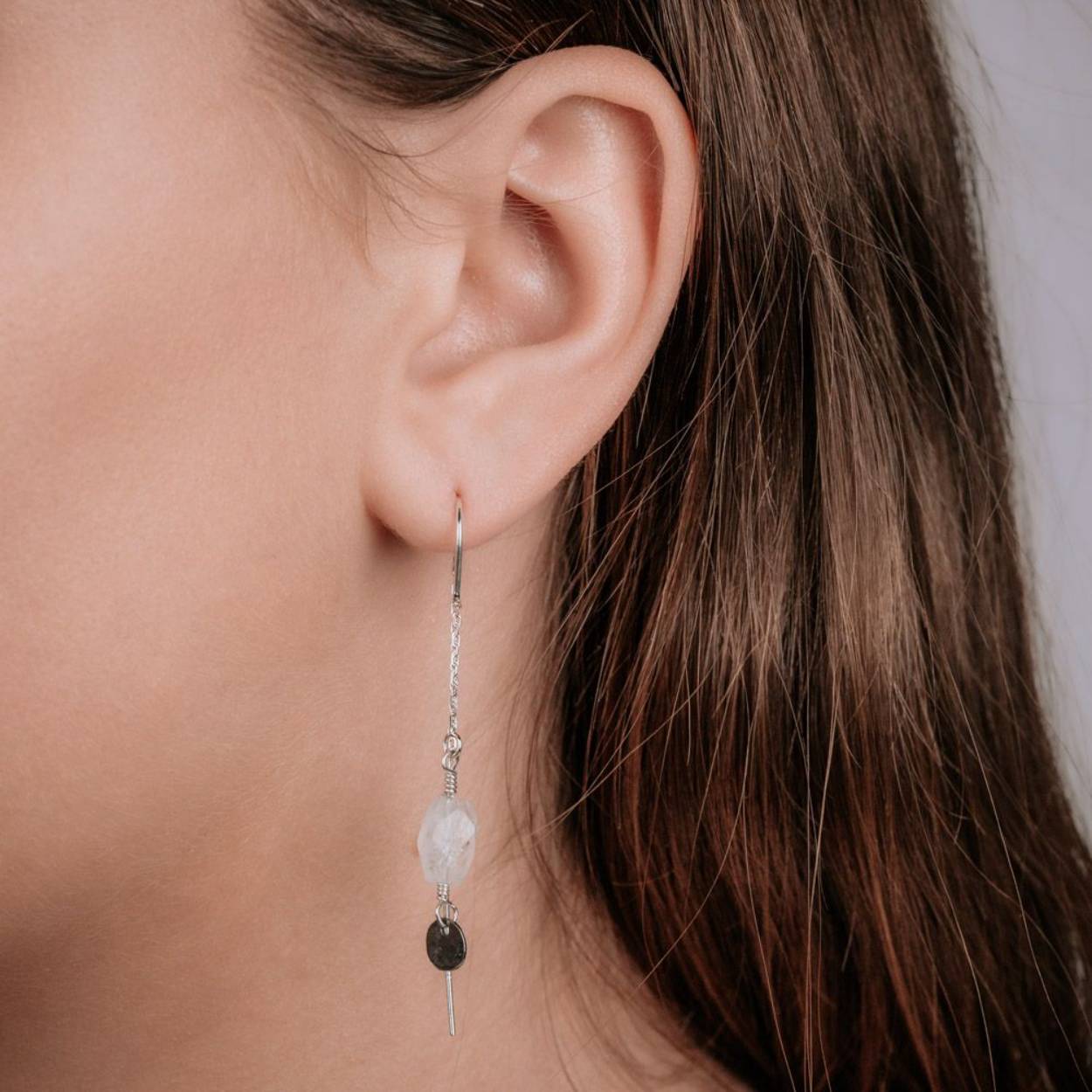 Doortrek oorbel gemaakt van 925 sterling zilver in combinatie met de edelsteen Regenboog Maansteen. Maansteen is de steen van de hoop. De steen staat voor intuitie gevoel en liefde. Perfect te combineren met onze andere sieraden met Maansteen!