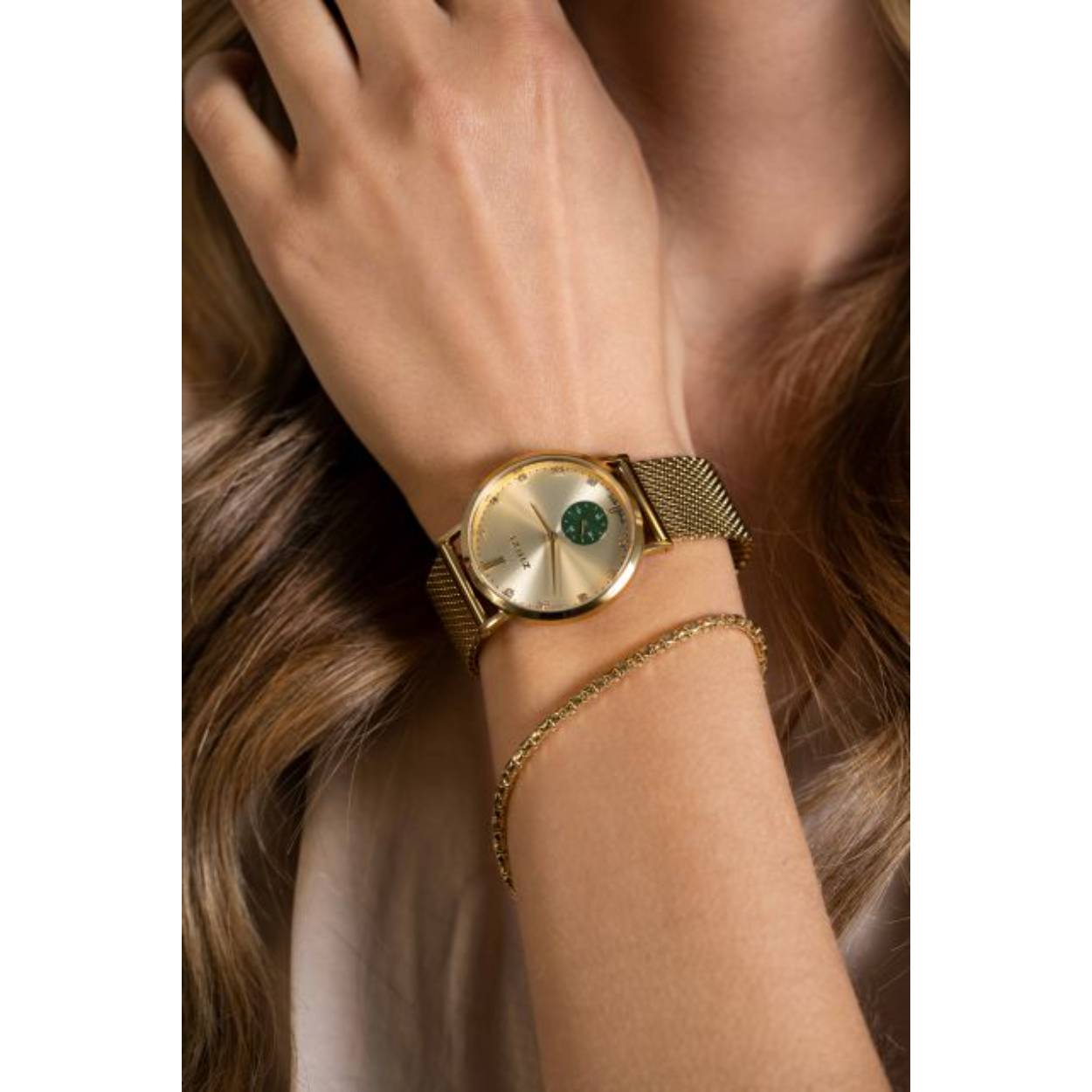 ZINZI Glam horloge groene wijzerplaat stalen kast geelgoudkleurig stalen mesh band geelgoudkleurig 34mm extra dun ZIW535M